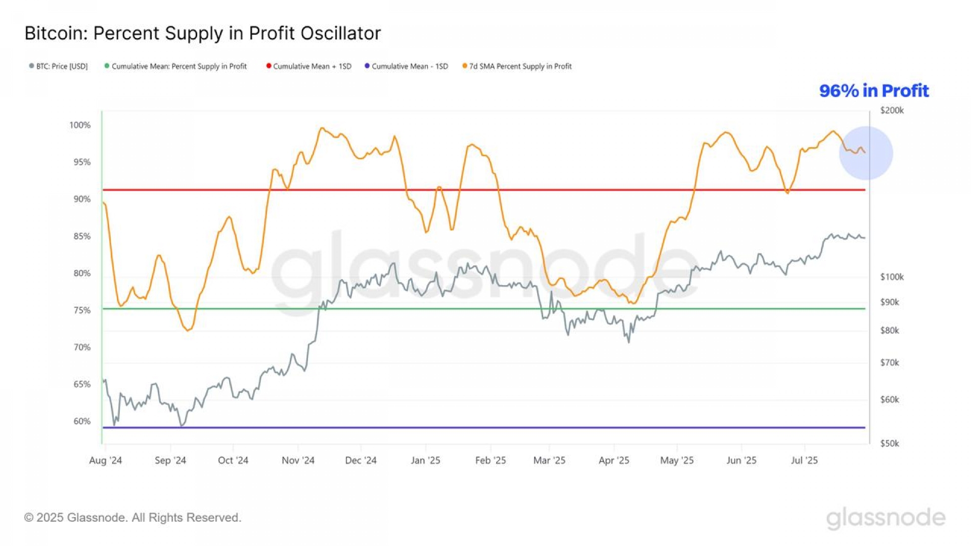 طبق داده‌های گلس‌نود، حدود ۹۶٪ از کل عرضه بیت‌کوین در شرایط فعلی در سود قرار دارد، که نشان‌دهنده قدرت روند صعودی و خریدهای هوشمند در سطوح پایین‌تر است.
