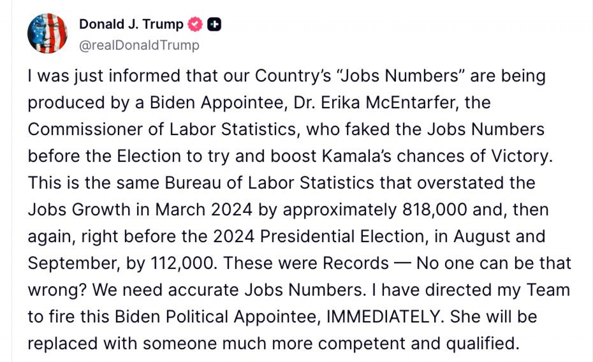 ترامپ می‌گوید رئیس BLS را به دلیل «دستکاری آمار اشتغال برای کمک به کامالا هریس در آستانه انتخابات» برکنار خواهد کرد.