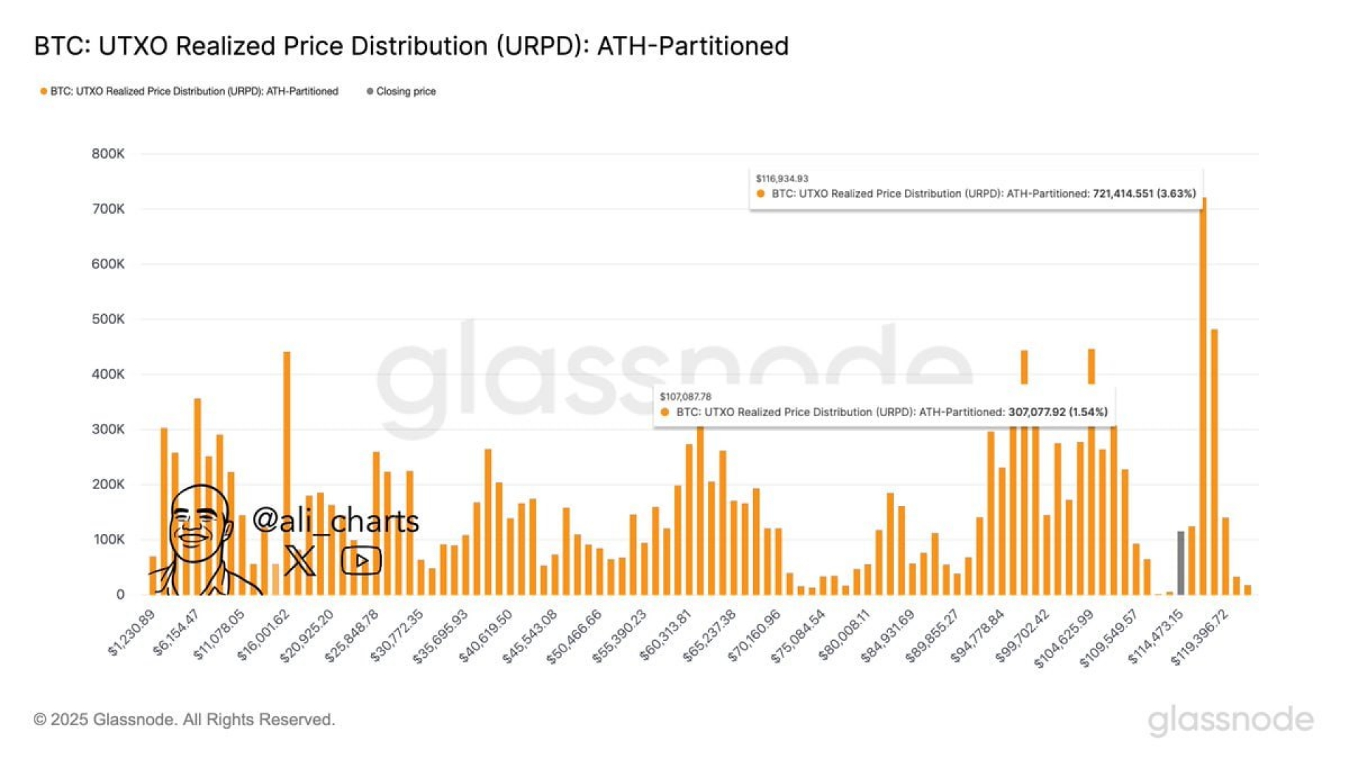 علی مارتینز هشدار داد در صورت تثبیت زیر سطح ۱۱۶٬۹۵۰ دلار، هدف بعدی بیت‌کوین طبق شاخص UTXO حدود ۱۰۷٬۰۰۰ دلار است؛ این یعنی احتمال کاهش حدود ۷ درصدی دیگر.