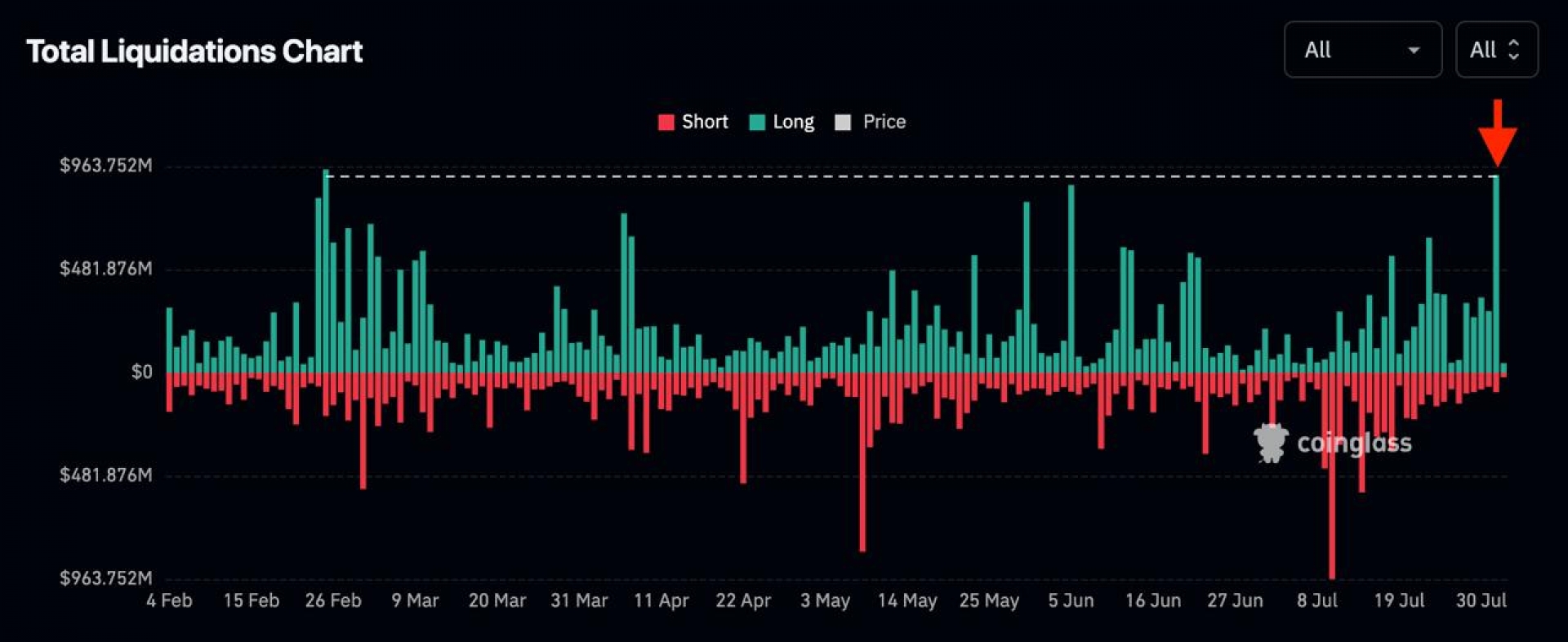 در تاریخ ۱ آگوست، شاهد سنگین‌ترین لیکویید پوزیشن‌های لانگ از ۲۵ فوریه بودیم؛ یک شستشوی اهرمی گسترده در بازار رخ داد.