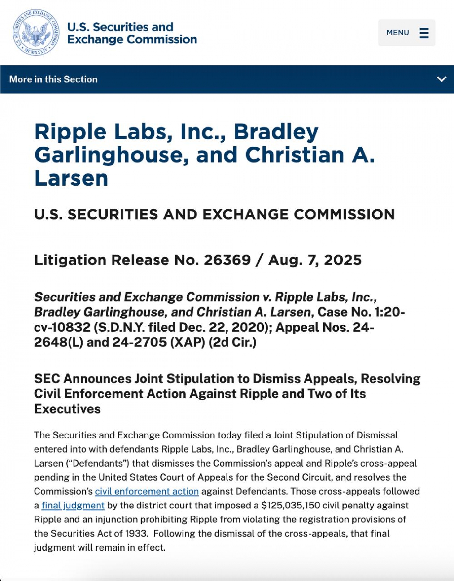 کمیسیون SEC با انتشار بیانیه حقوقی، از حل‌وفصل پرونده خود علیه ریپل خبر داد.