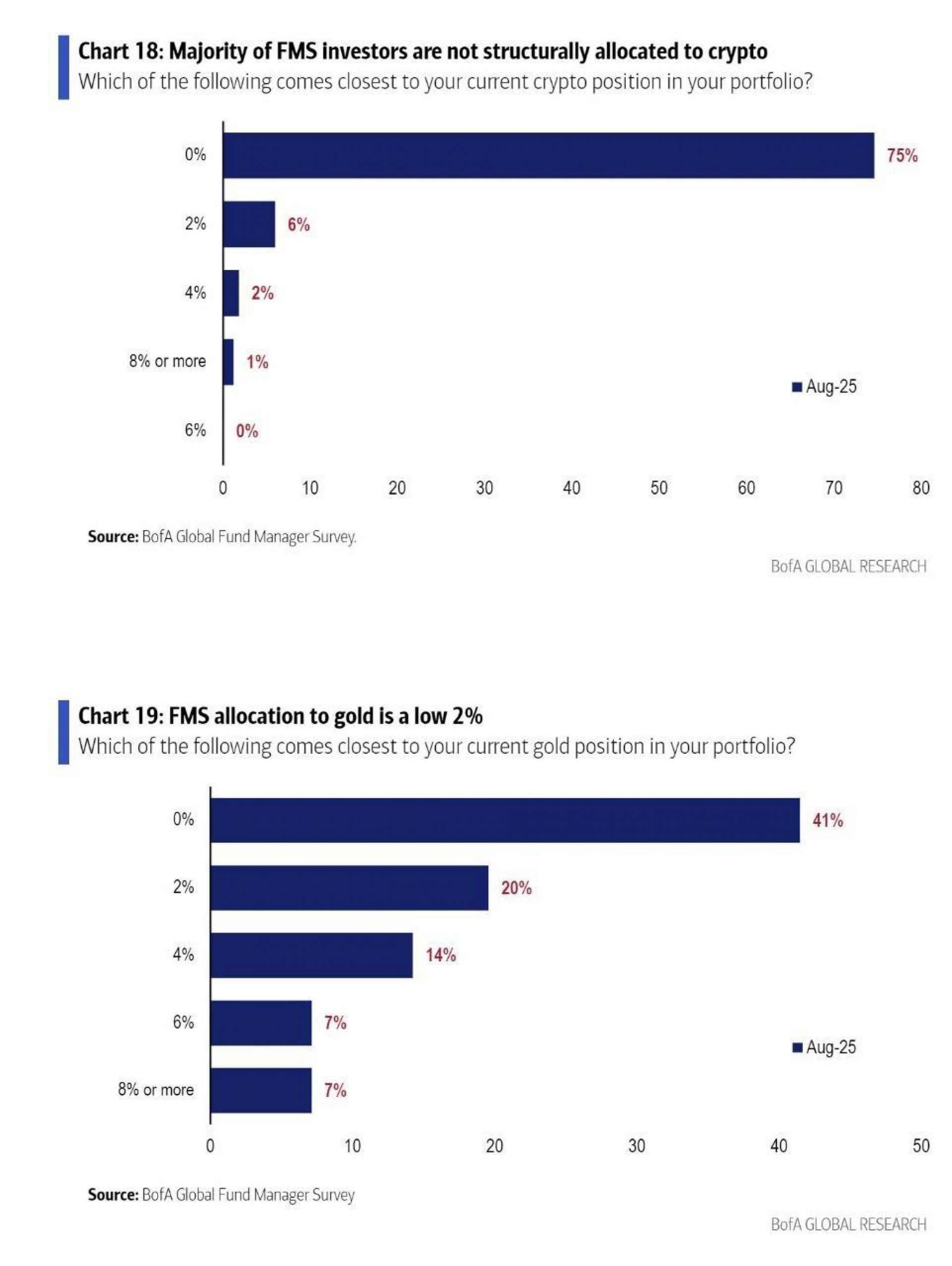 ۷۱٪ از مدیران صندوق هیچ بیت‌کوین یا رمزارزی در سبد خود ندارند و تنها ۱٪ بیش از ۸٪ سبد را به رمزارز اختصاص داده‌اند. همچنین ۴۱٪ هیچ طلایی در سبد خود ندارند و تنها ۷٪ بیش از ۸٪ سبد را به طلا اختصاص داده‌اند.