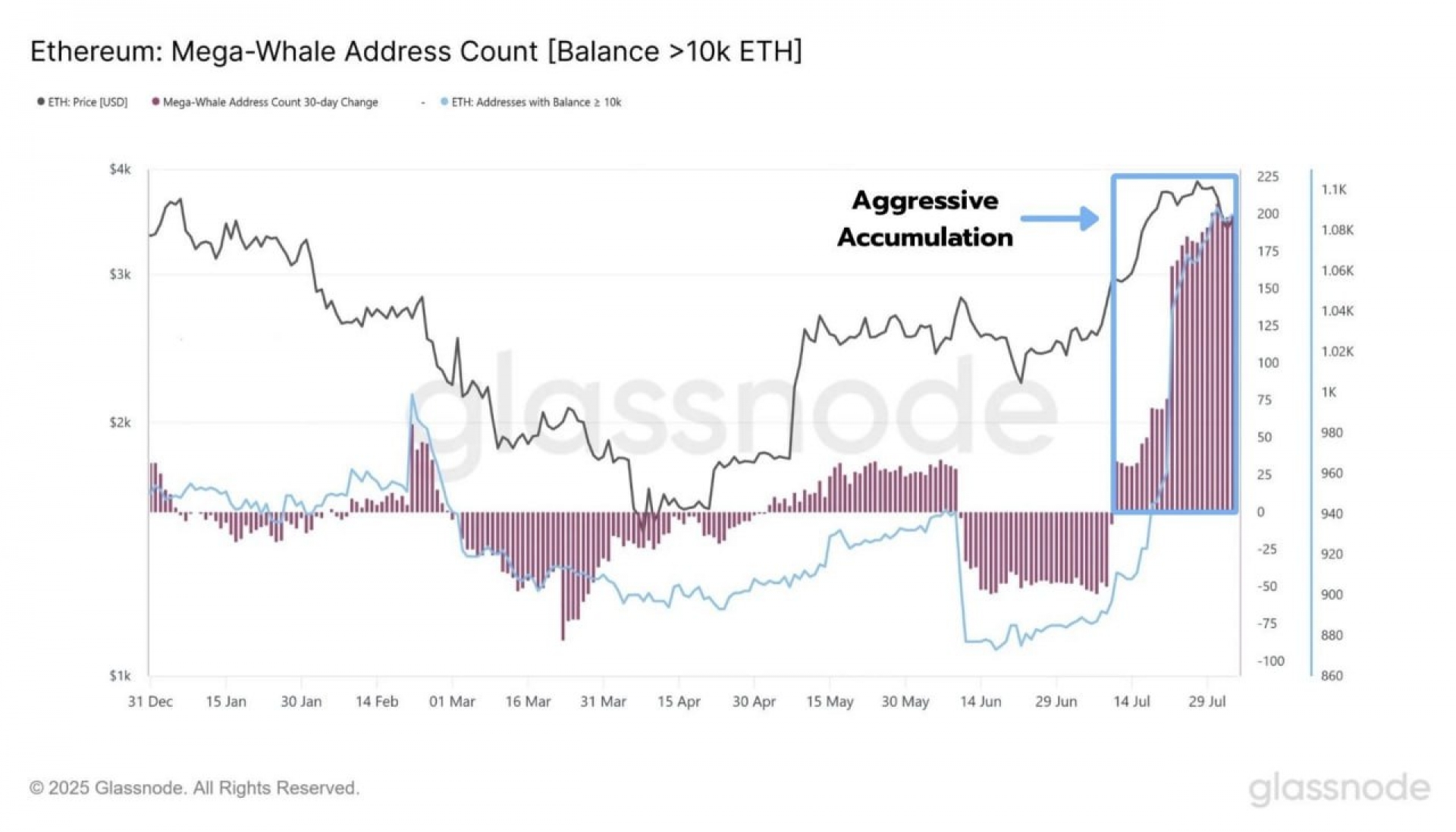داده‌های Glassnode نشان می‌دهد نهنگ‌های بزرگ اتریوم (بیش از ۱۰ هزار ETH) از اکتبر ۲۰۲۴ تاکنون دارایی‌های خود را ۹.۳۱٪ افزایش داده‌اند و بیش از ۳.۵ میلیون اتریوم به موجودی‌شان افزوده‌اند. این خرید تهاجمی در زمان افت قیمت، نشانه‌ای از اعتماد بالای سرمایه‌گذاران بزرگ است.