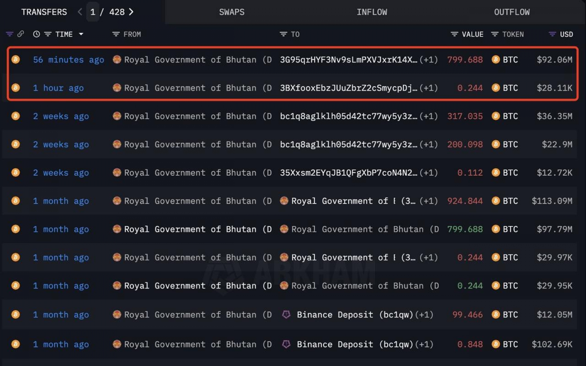 دولت سلطنتی بوتان یک ساعت پیش بار دیگر ۸۰۰ بیت‌کوین به ارزش حدود ۹۲.۰۸ میلیون دلار منتقل کرده است.