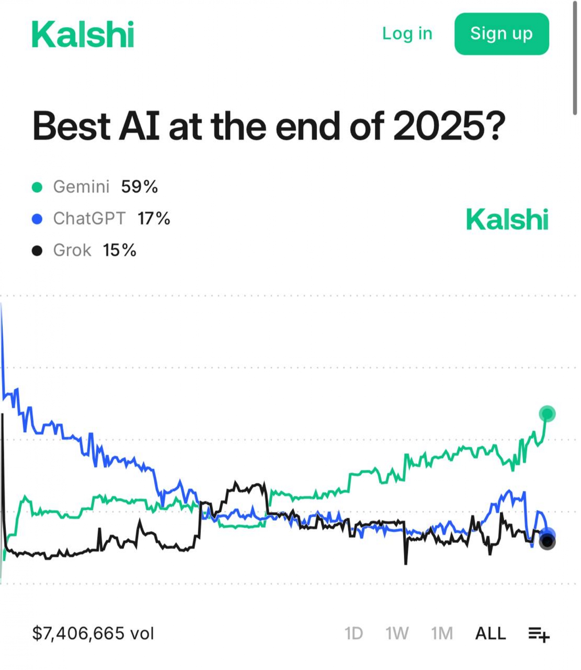 داده‌های Kalshi نشان می‌دهد احتمال اینکه Gemini تا پایان ۲۰۲۵ به برترین هوش مصنوعی تبدیل شود ۵۹٪ برآورد شده است؛ در مقایسه با ChatGPT با ۱۷٪ و Grok با ۱۵٪.