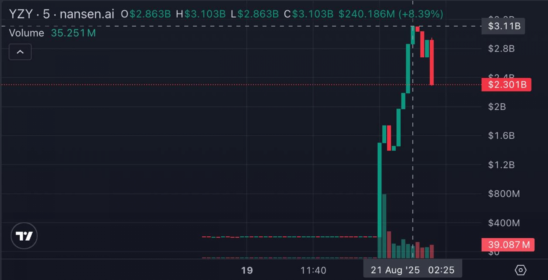 رپر مشهور «یه» (Kanye West) توکن جدید خود با نماد $YZY را راه‌اندازی کرد. طبق داده‌های Nansen ارزش بازار این توکن به‌طور موقت بیش از ۳ میلیارد دلار رسید.
