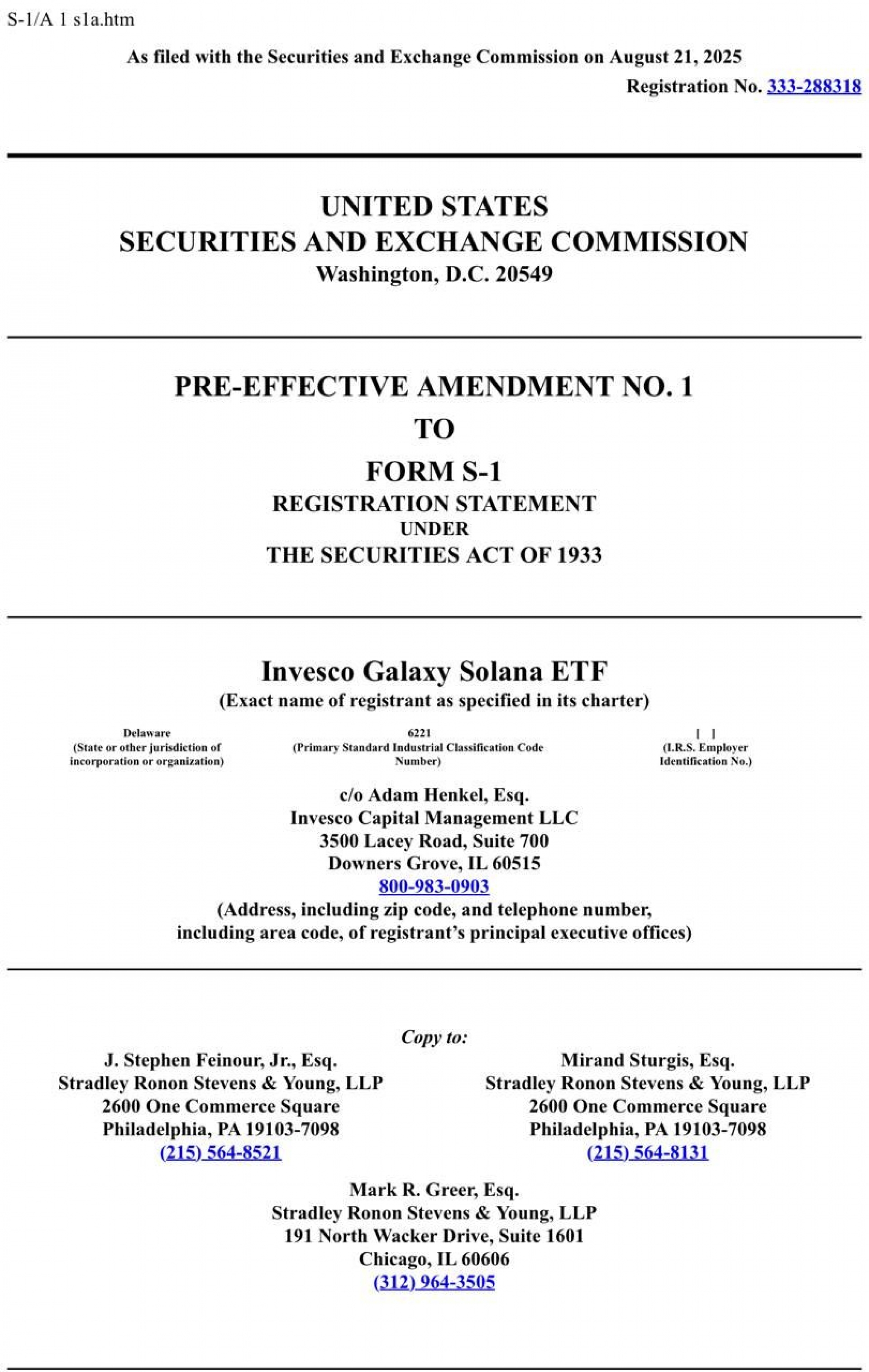 شرکت Invesco Galaxy فرم اصلاح‌شده S-1 مربوط به ETF سولانا را به کمیسیون بورس و اوراق بهادار آمریکا (SEC) ارائه کرد.