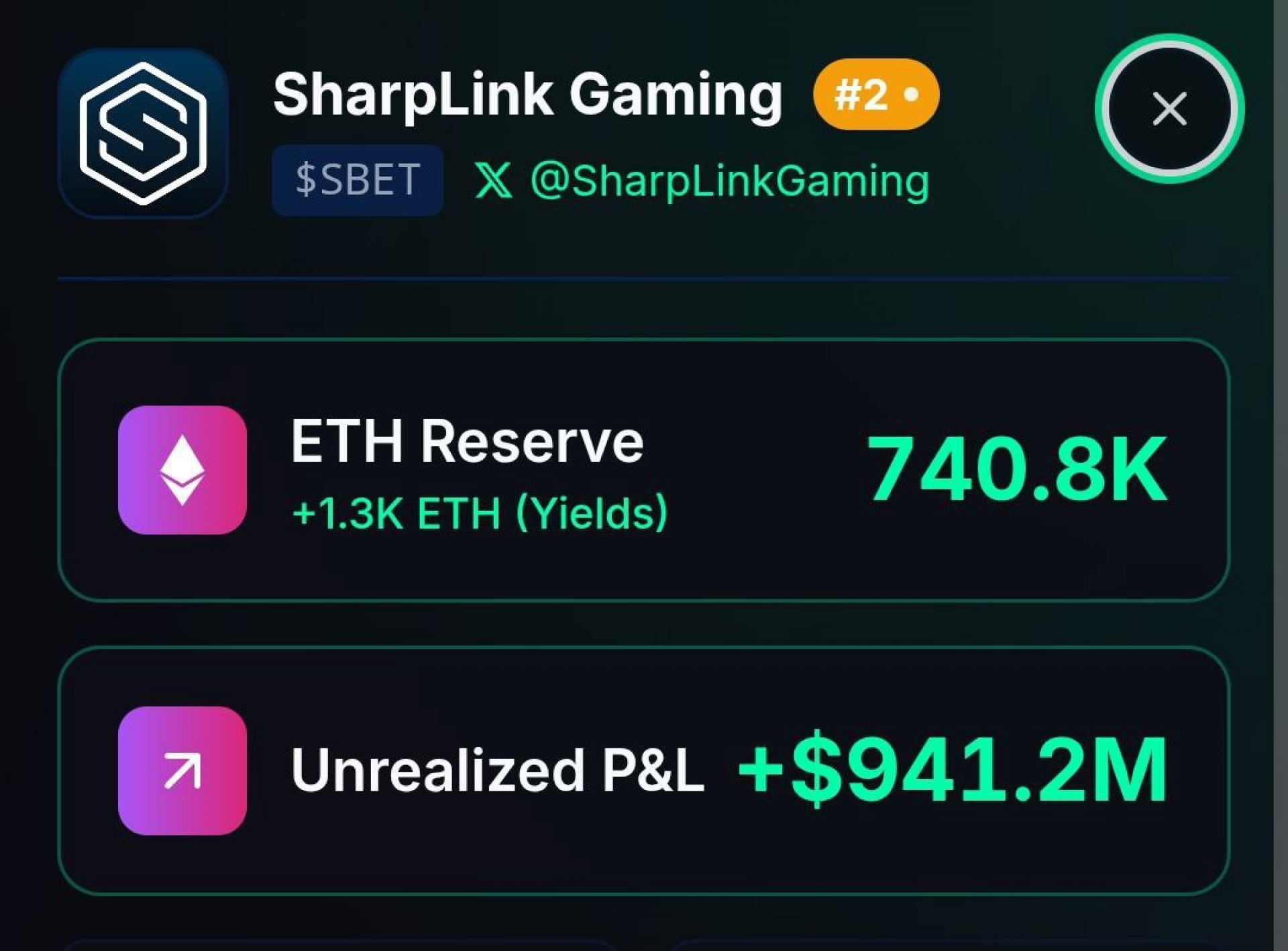 شرکت Sharplink Gaming اکنون ۹۴۱ میلیون دلار سود تحقق‌نیافته در اختیار دارد که موقعیت قدرتمند این شرکت را در بازار نشان می‌دهد.