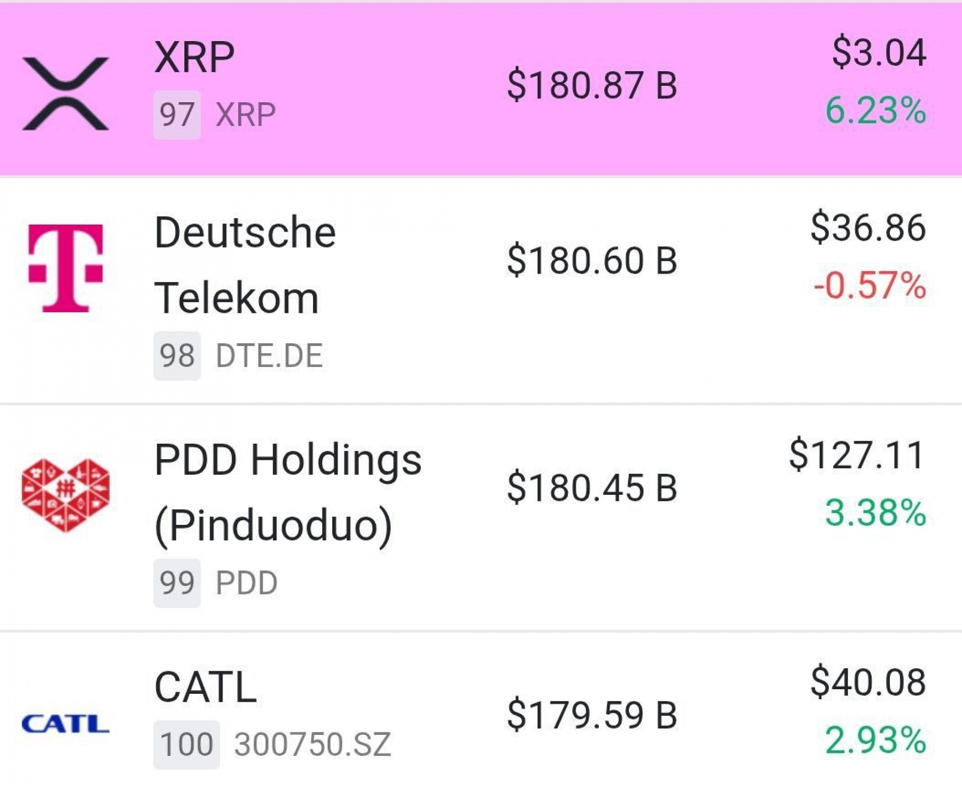 توکن ریپل ($XRP) با عبور از شرکت‌های Pinduoduo، دویچه تله‌کام و CATL توانست وارد فهرست ۱۰۰ دارایی بزرگ بازار از نظر ارزش بازار شود.