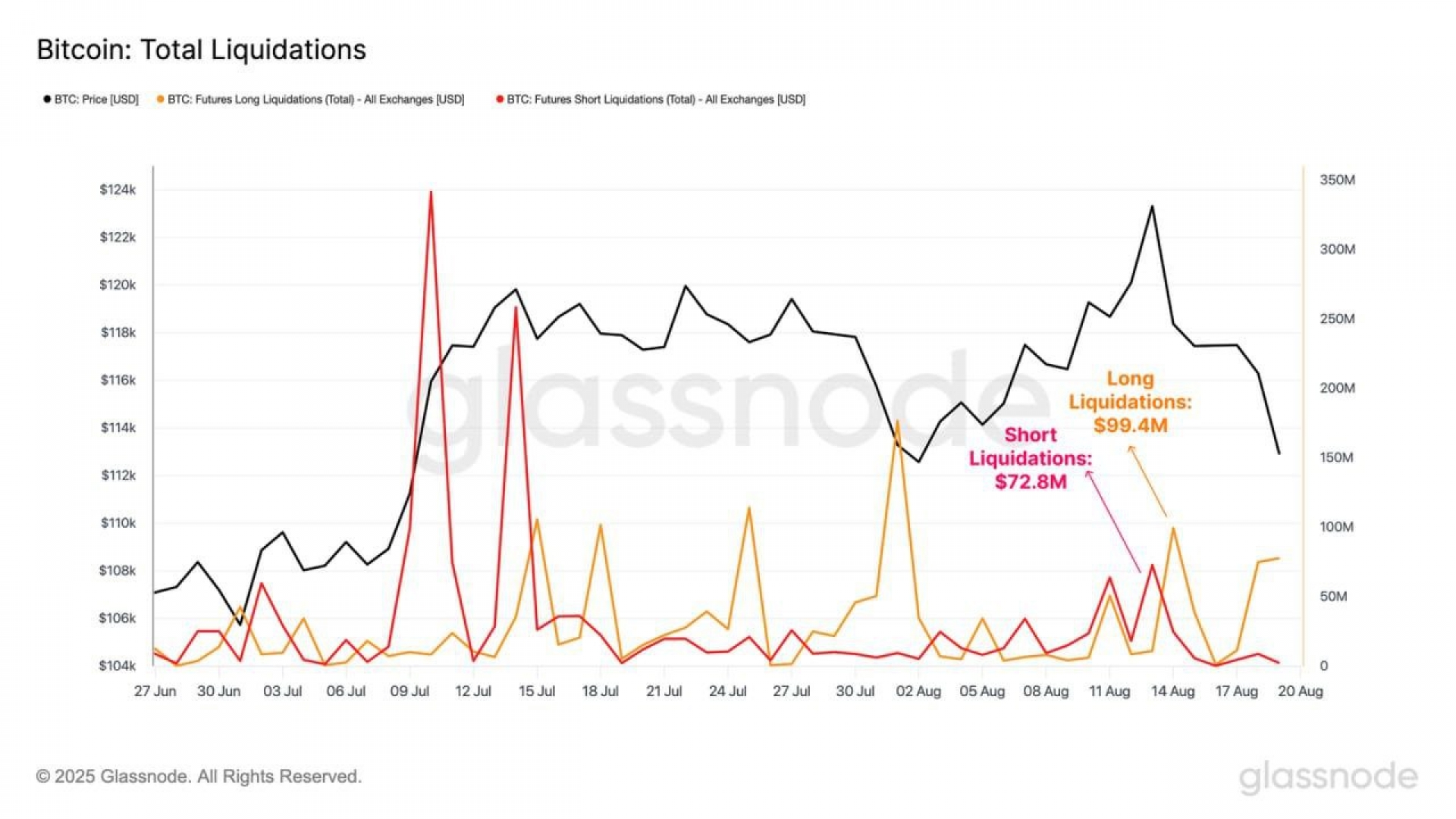 در نوسانات اخیر، نقدینگی افزایش یافت؛ پوزیشن‌های فروش (Shorts) در اوج قیمت به ۷۴ میلیون دلار و پوزیشن‌های خرید (Longs) در زمان اصلاح به ۹۹ میلیون دلار رسیدند.