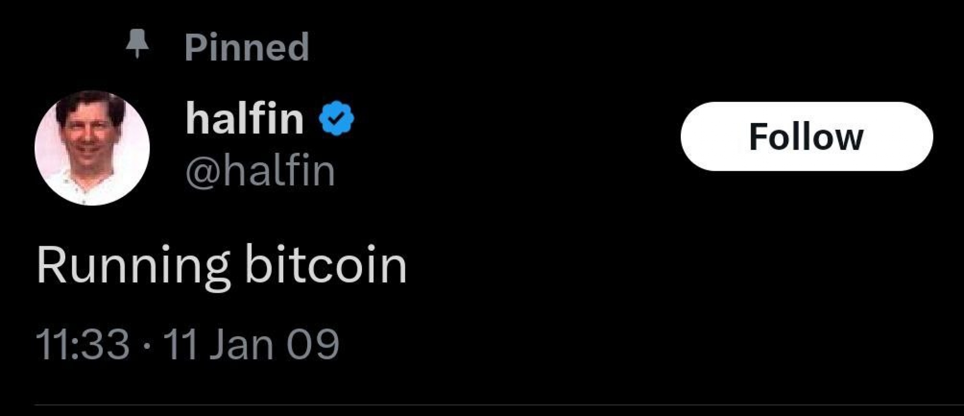 حدود ۱۶.۵ سال پیش، Hal Finney نخستین فردی بود که اجرای بیت کوین را آغاز کرد.