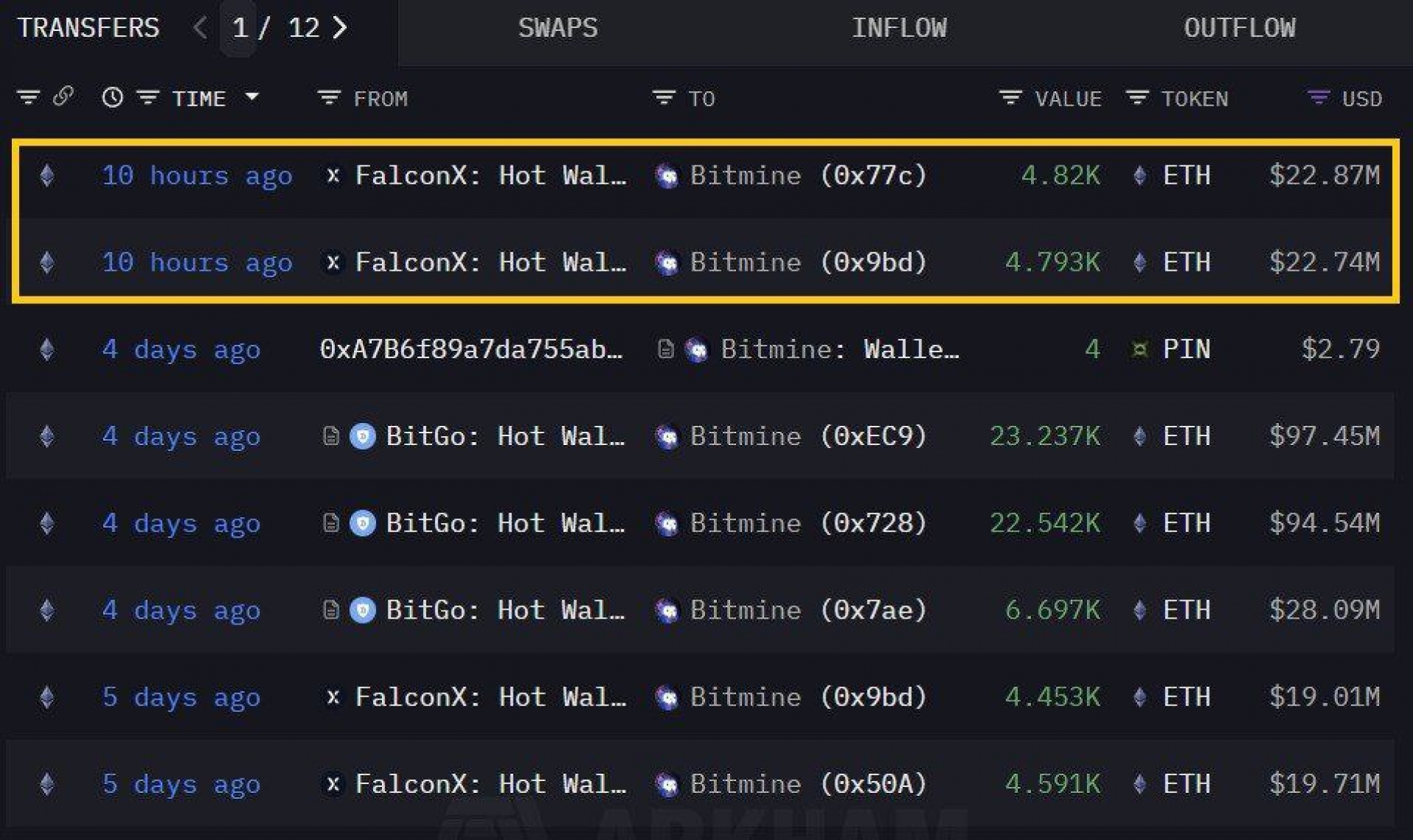 شرکت Bitmine بار دیگر ۹,۶۱۳ واحد اتریوم ($ETH) به ارزش ۴۵ میلیون دلار به دارایی‌های خود افزود.