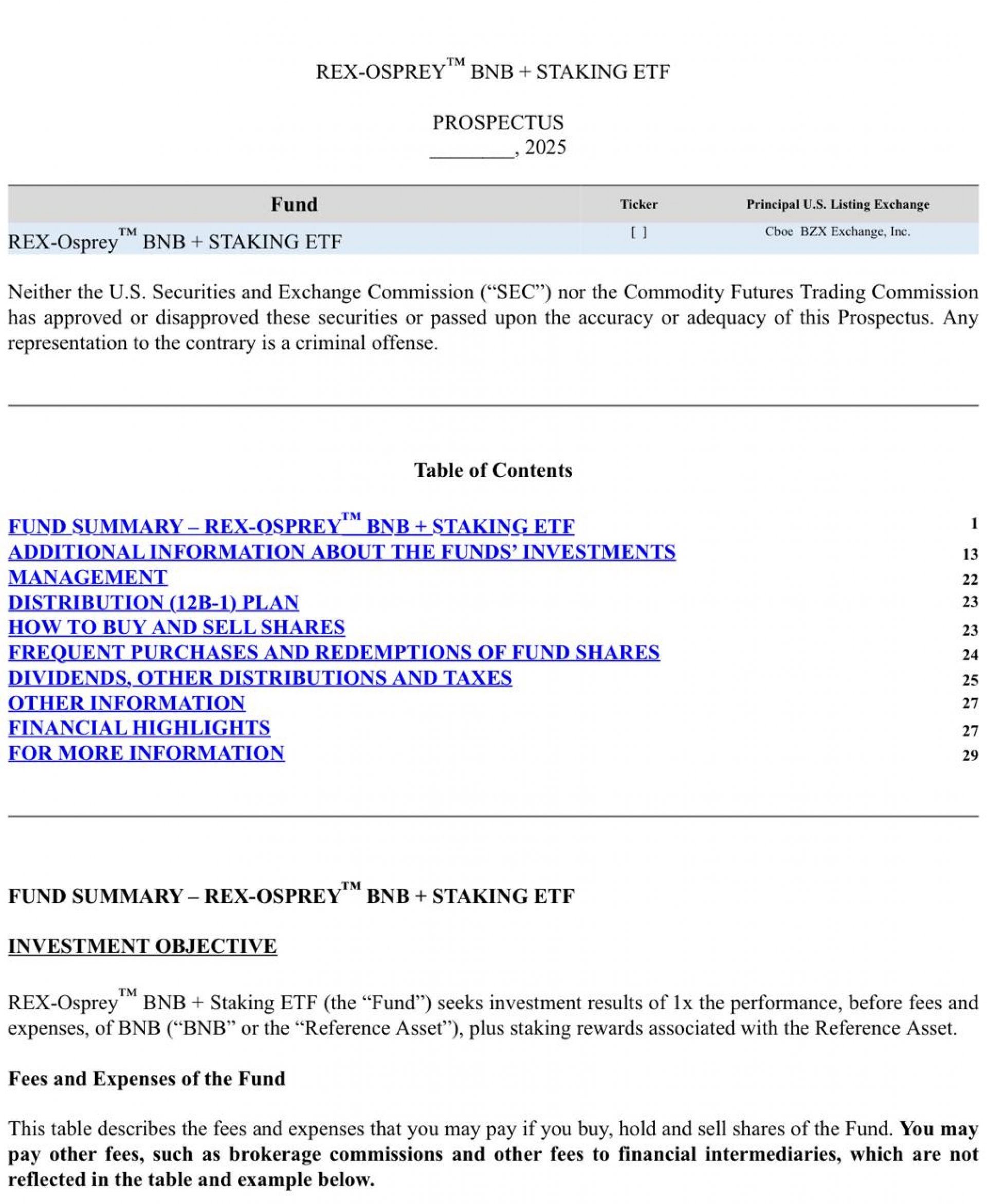 شرکت Rex Osprey برای راه‌اندازی یک ETF مبتنی بر BNB و استیکینگ آن، درخواست رسمی خود را به SEC ارائه کرده است.