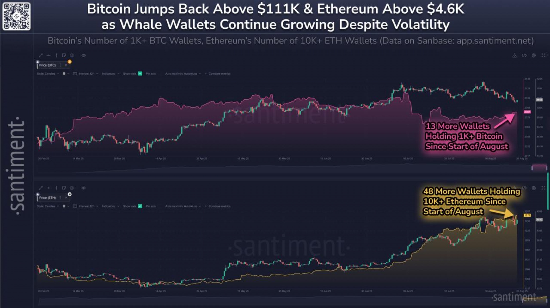 تعداد کیف‌پول‌های بزرگ در حال رشد است؛ در ماه آگوست ۱۳ آدرس جدید با بیش از ۱۰۰۰ بیت‌کوین و ۴۸ آدرس جدید با بیش از ۱۰هزار اتریوم اضافه شده است.