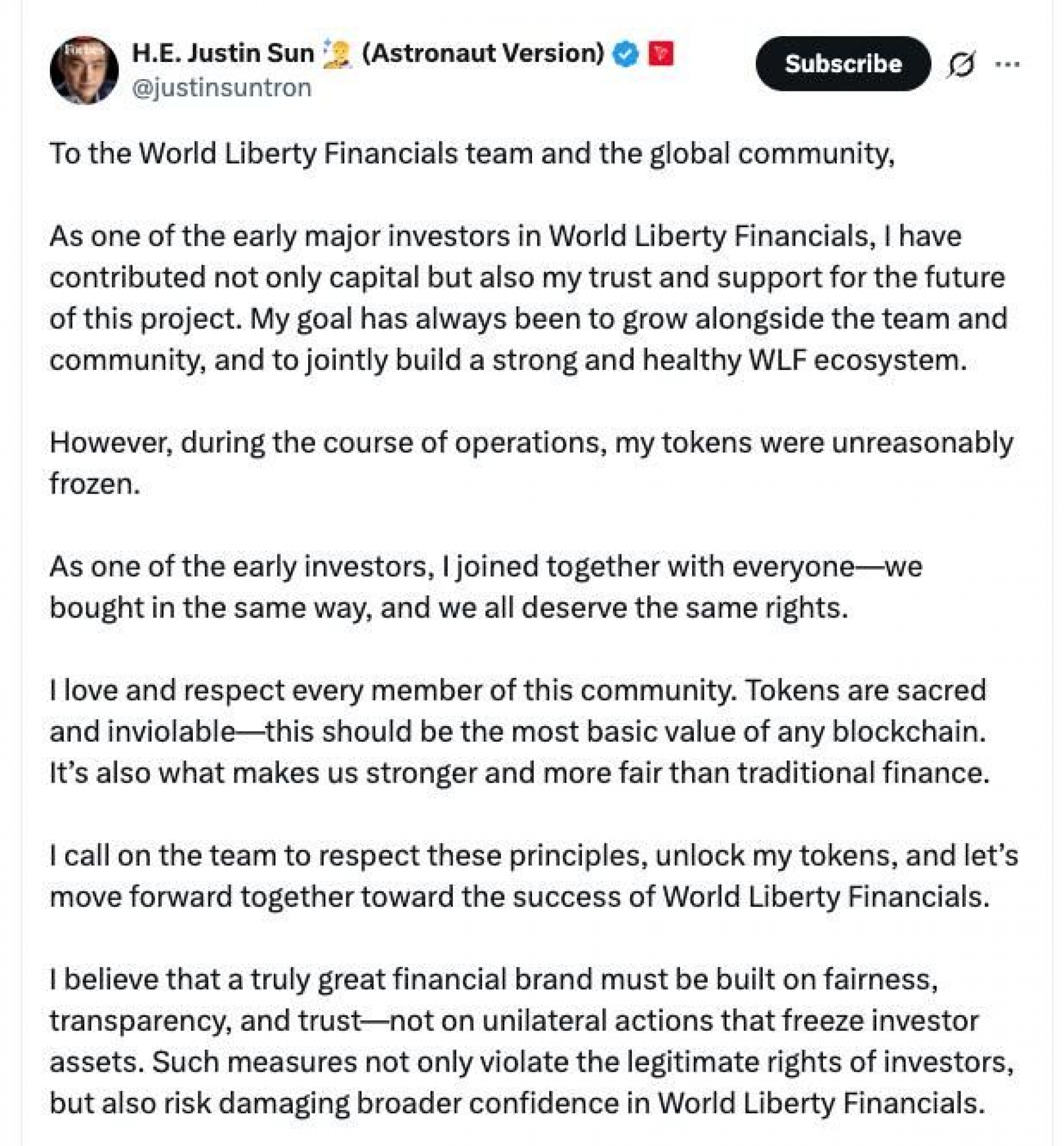 “توکن‌هایم به‌طور غیر منطقی فریز شدند” — جاستین سان، از سرمایه‌گذاران اولیه پروژه World Liberty Financial، در بیانیه‌ای جذاب به تیم WLFI هشدار داد که یخ‌زدگی توکن‌هایش (بدون دلیل مشخص) نه‌تنها حقوق مشروع سرمایه‌گذاران را نقض می‌کند، بلکه اعتبار پروژه را نیز به خطر می‌اندازد.