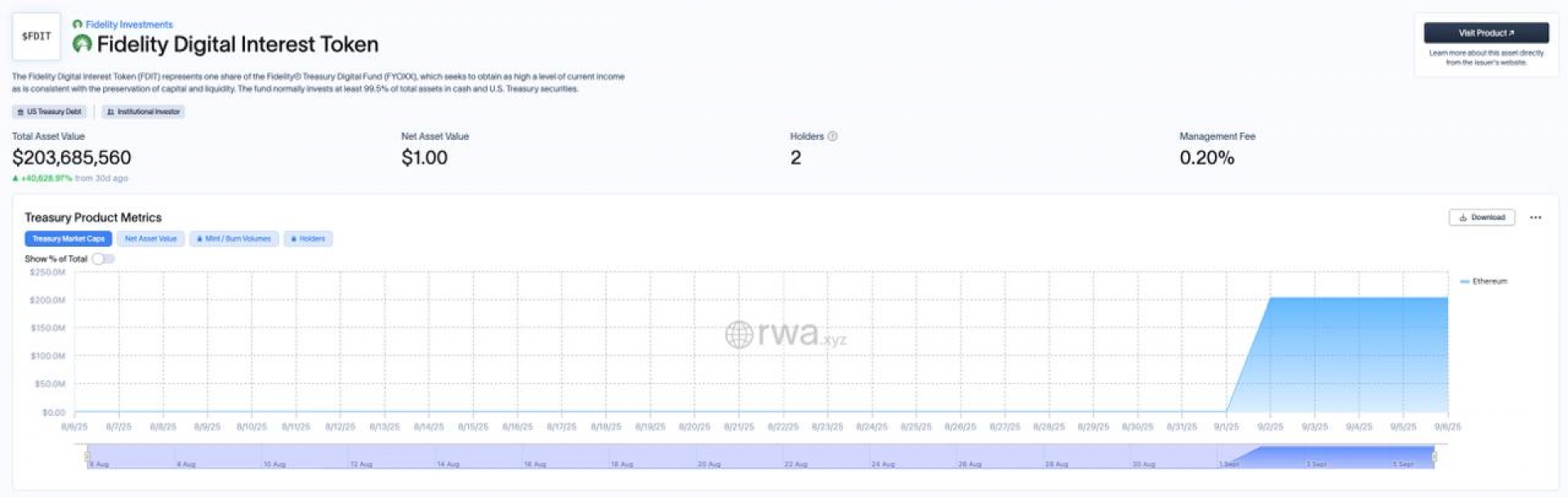 توکنی از سوی فیدلیتی (Fidelity) که بر بستر اتریوم ساخته شده، در پلتفرم RWA.xyz لیست شد. ارزش کل دارایی‌های این توکن ۲۰۳.۶ میلیون دلار اعلام شده است.