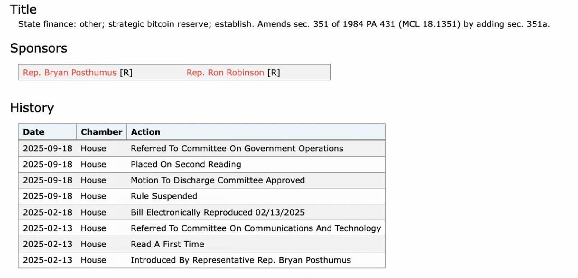 لایحه HB 4087 ایالت میشیگان برای نخستین بار از فوریه پیشرفت کرده و به قرائت دوم در مجلس و کمیته عملیات دولتی ارجاع داده شد. این لایحه به ایالت اجازه می‌دهد حداکثر ۱۰٪ از منابع مالی خود را در ارزهای دیجیتال سرمایه‌گذاری کند.