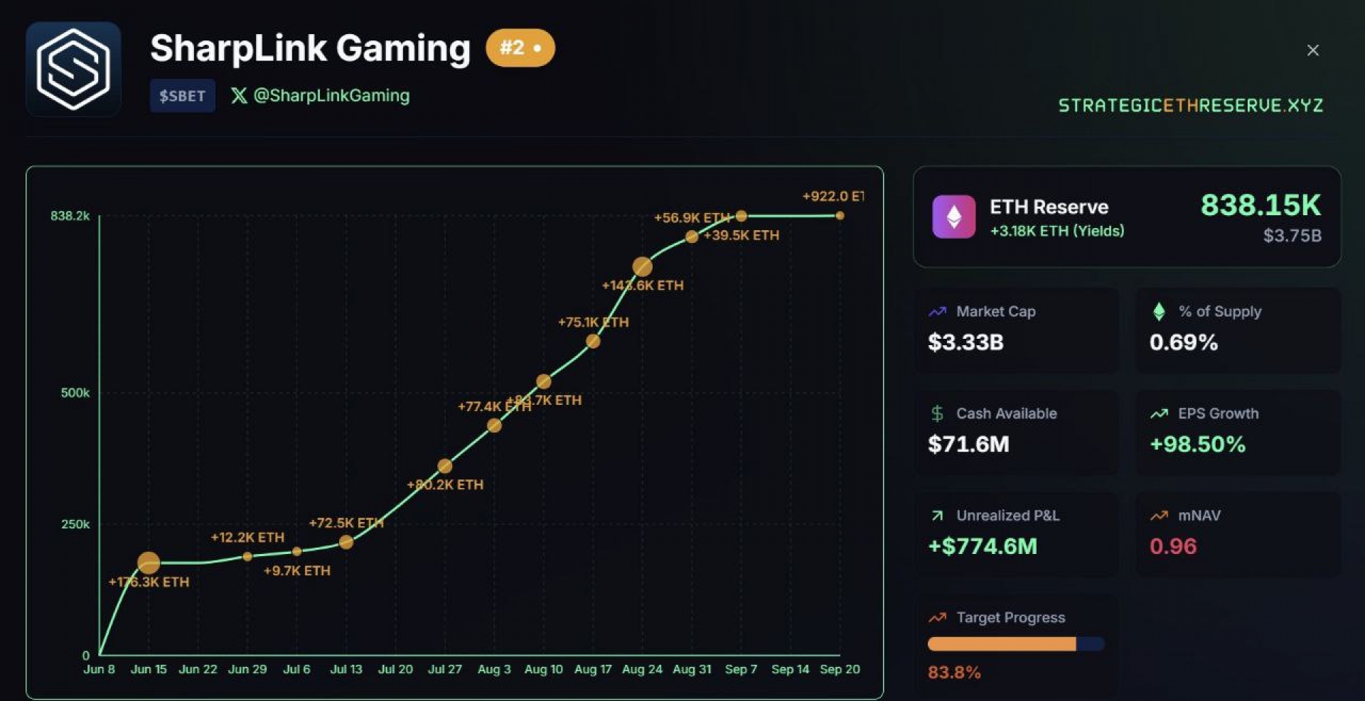 شرکت SharpLink Gaming اکنون فقط ۱۶.۲ درصد با دستیابی به هدف تعیین‌شده خود فاصله دارد.