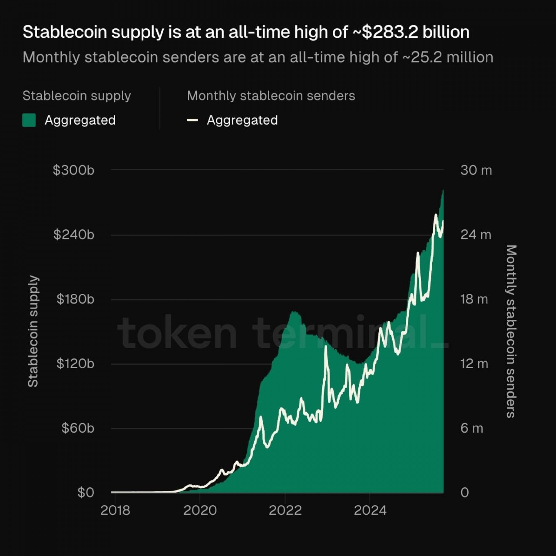 عرضه استیبل‌کوین‌ها به اوج تاریخی ۲۸۳.۲ میلیارد دلار رسید و همزمان تعداد کاربران ماهانه ارسال‌کننده استیبل‌کوین‌ها نیز با ثبت ۲۵.۲ میلیون نفر به رکورد جدیدی دست یافت.