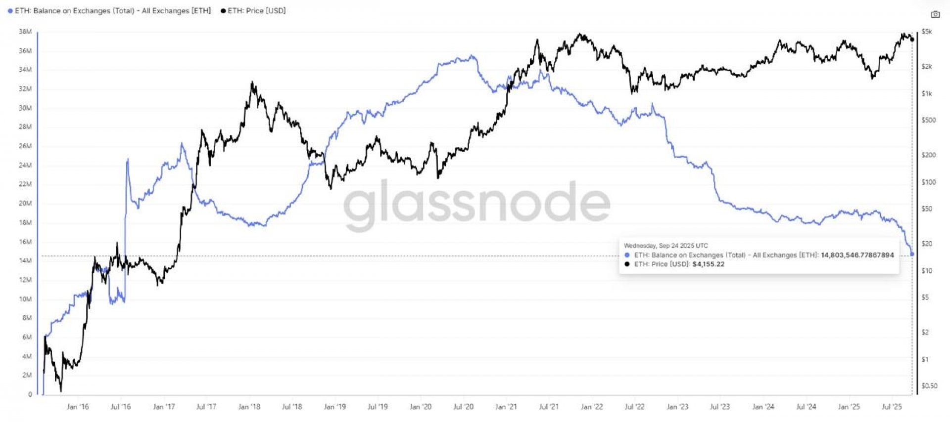 موجودی اتریوم در صرافی‌ها به ۱۴.۸ میلیون ETH کاهش یافته که پایین‌ترین سطح از ۹ سال گذشته تاکنون محسوب می‌شود.