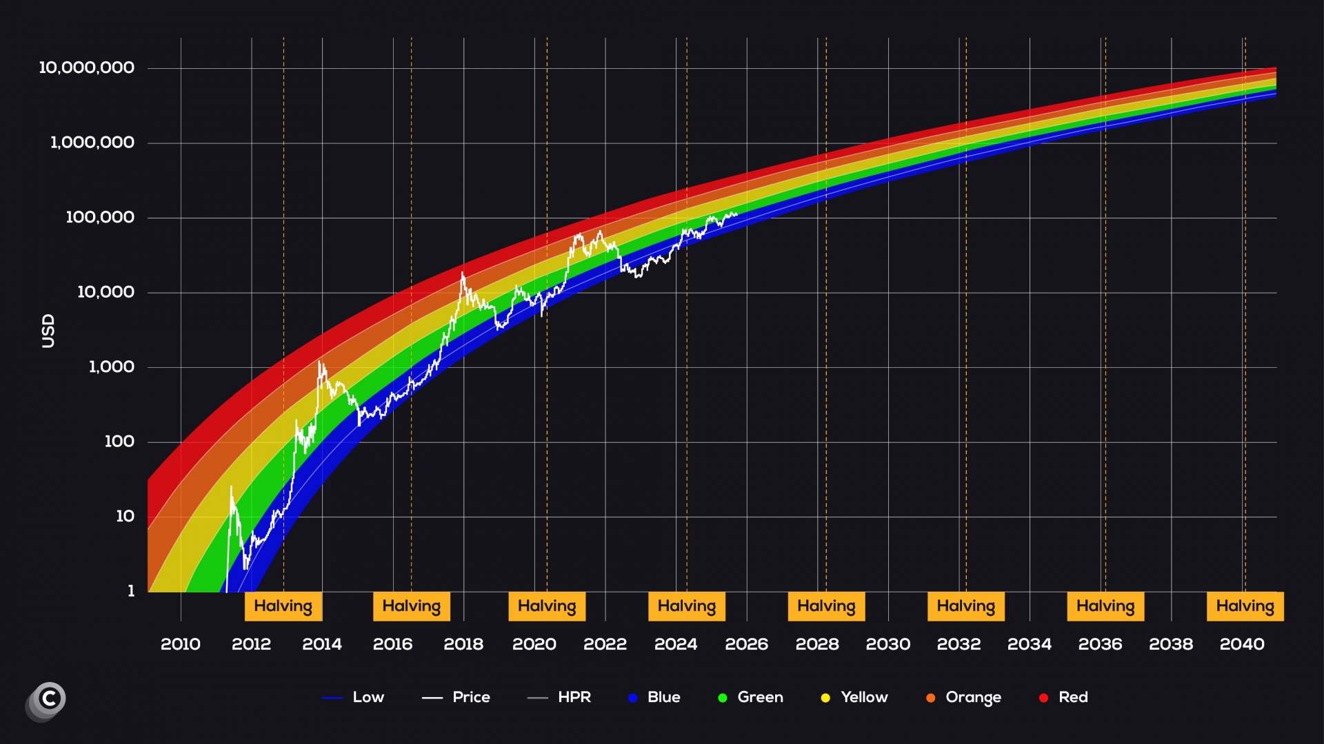 نمودار رنگین‌کمانی بیت‌کوین بار دیگر روند رشد بلندمدت این دارایی را نشان می‌دهد و طبق این مدل، مسیر قیمتی می‌تواند در آینده تا محدوده ۱ میلیون دلار ادامه یابد.