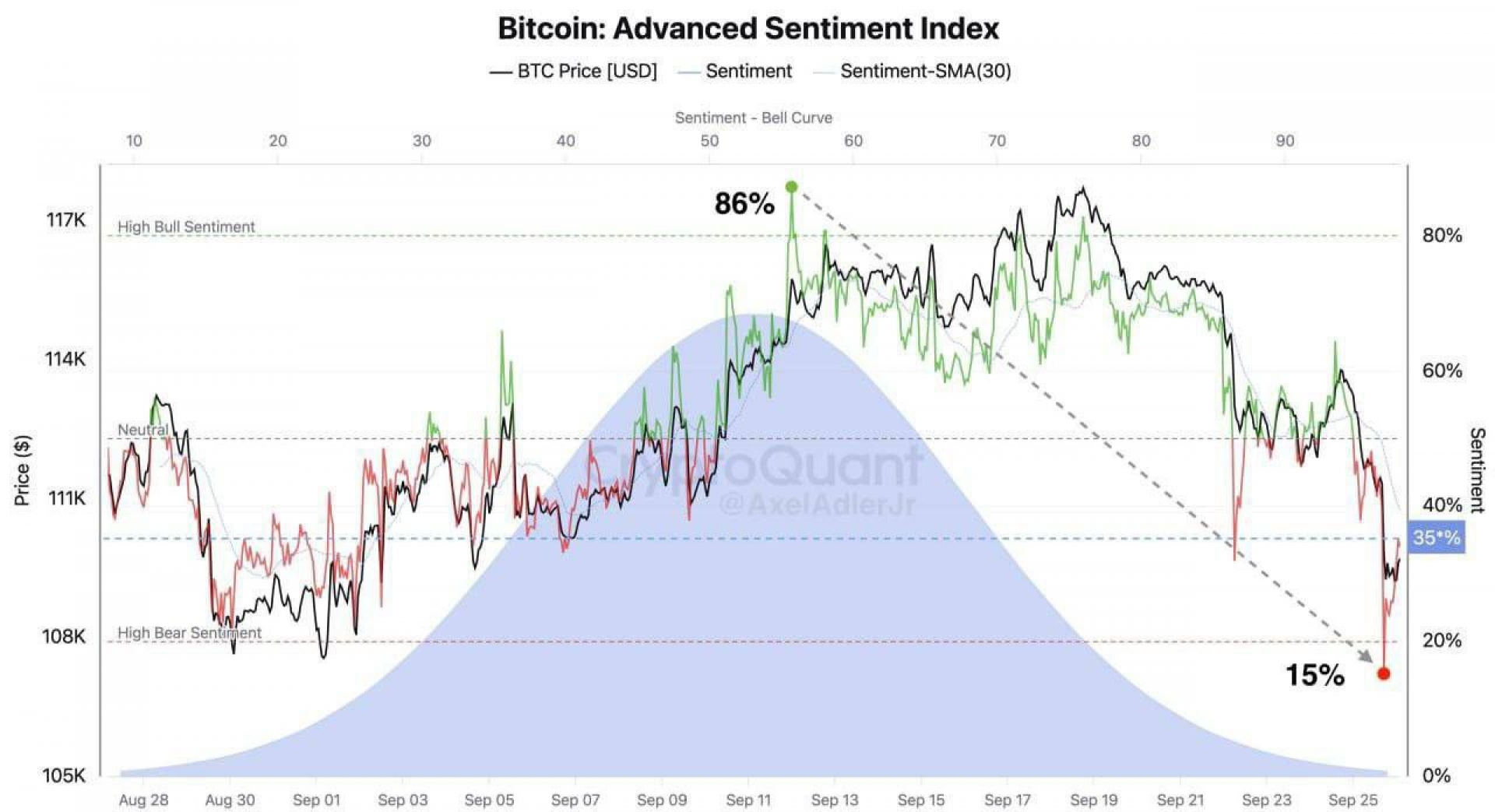 در دو هفته اخیر، شاخص پیشرفته احساسات از سطح بسیار صعودی ۸۶٪ به محدوده نزولی ۱۵٪ کاهش یافته است. معمولاً مقادیر کمتر از ۲۰٪ می‌تواند محرکی برای بازگشت‌های تکنیکالی باشد؛ اما برای تأیید یک روند صعودی پایدار، لازم است این شاخص دوباره به بالای ۴۰٪ تا ۴۵٪ برسد و میانگین متحرک ۳۰ روزه نیز روند صعودی پیدا کند.