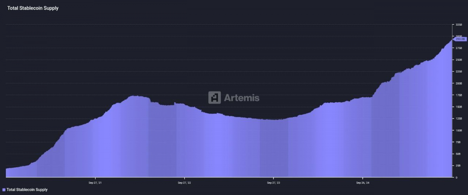 عرضه کل استیبل‌کوین‌ها به رکورد تاریخی جدید ۲۹۳ میلیارد دلار رسید.