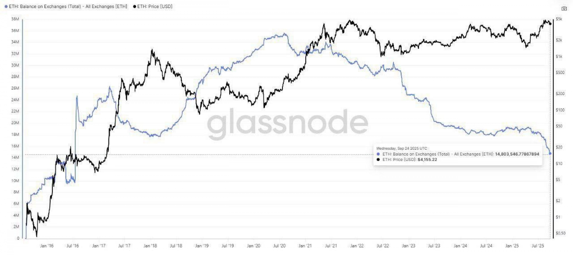 میزان موجودی اتریوم (ETH) در صرافی‌های متمرکز به ۱۴.۸ میلیون واحد کاهش یافته است؛ سطحی که از سال ۲۰۱۶ تاکنون بی‌سابقه بوده است. این کاهش می‌تواند به معنای عرضه کمتر برای فروش سریع و افزایش تمایل به هولد و استیکینگ باشد؛ عاملی که معمولاً فشار فروش را کاهش داده و چشم‌انداز صعودی بلندمدت را تقویت می‌کند.