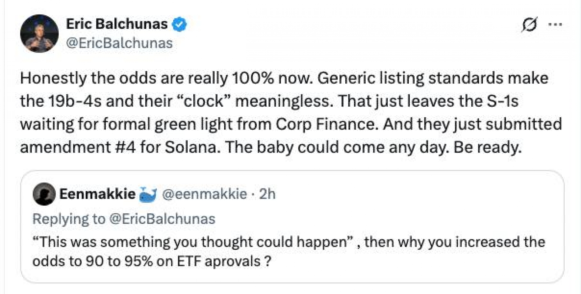 اریک بالچوناس، تحلیلگر ETF بلومبرگ، اعلام کرد با توجه به استانداردهای جدید لیستینگ عمومی، احتمال تأیید ETFهای کریپتو «عملاً ۱۰۰ درصد» شده است.