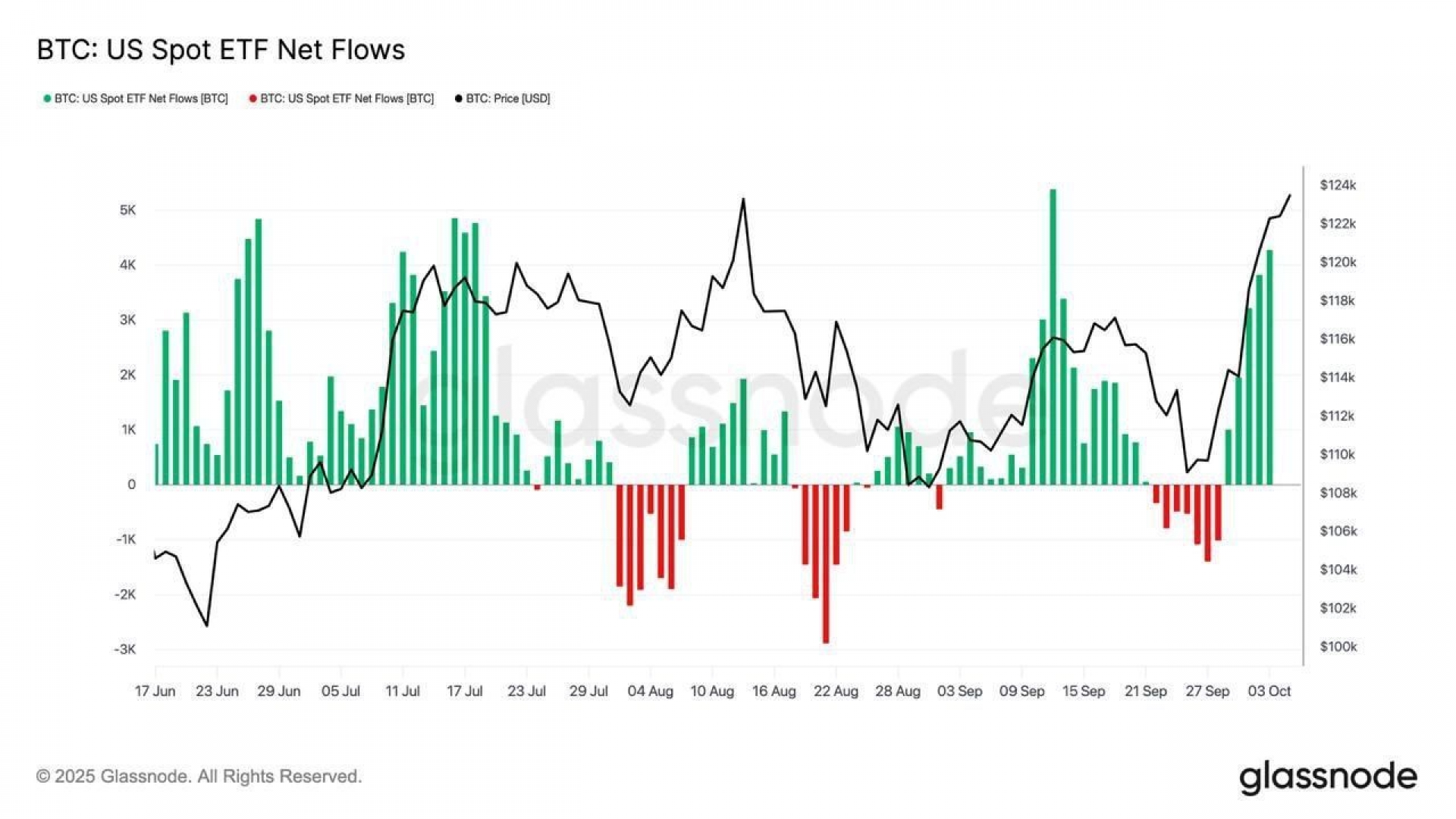 جریان‌های نقدی ETFهای بیت‌کوین بار دیگر به شدت مثبت شده‌اند و قیمت را به بالاترین رکورد تاریخی جدید رسانده‌اند. این بازگشت سرمایه پس از هفته‌ها خروج، نشانه‌ای از تغییر ساختاری در جریان‌های سرمایه و تقویت حمایت بازار در سه‌ماهه چهارم است.