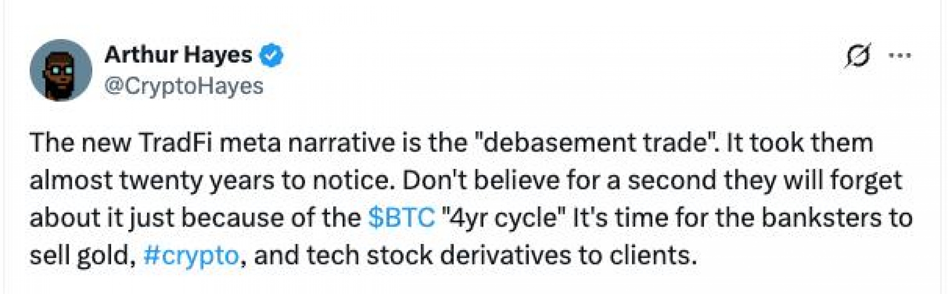 آرتور هیز، هم‌بنیان‌گذار BitMEX، اعلام کرد که روایت جدید دنیای مالی سنتی (TradFi) حول محور کاهش ارزش پول (Debasement Trade) شکل گرفته است. او پیش‌بینی می‌کند که بانک‌ها پس از حدود ۲۰ سال، دوباره فروش مشتقات مرتبط با طلا، رمزارزها و سهام فناوری را به مشتریان خود آغاز کنند.
