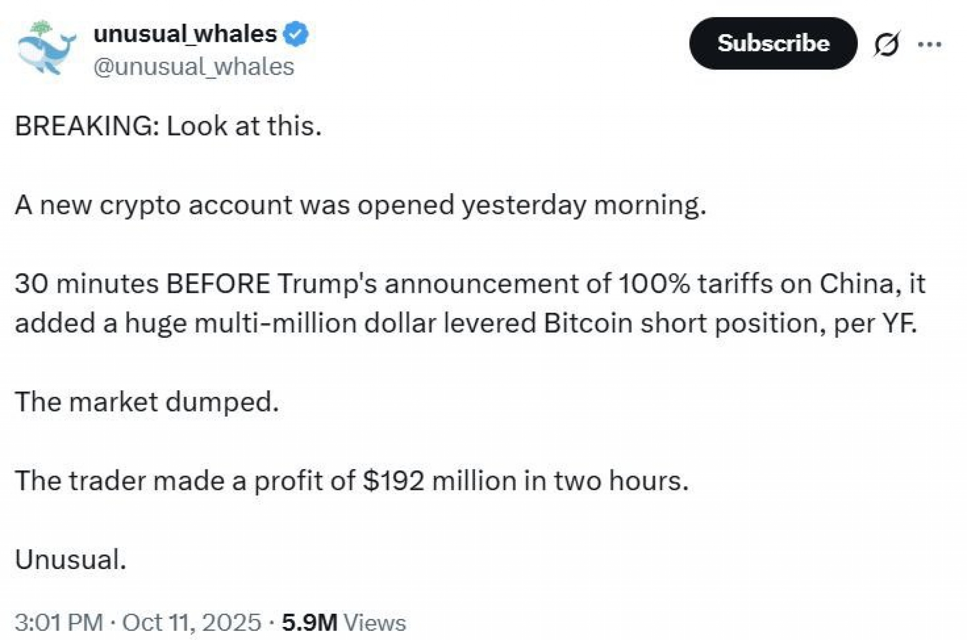 تنها ۳۰ دقیقه پیش از اعلام تعرفه ۱۰۰ درصدی ترامپ بر چین، یک حساب تازه‌وارد رمزارزی موقعیت فروش اهرمی چندمیلیون دلاری روی بیت‌کوین باز کرد. به گزارش YF، پس از سقوط بازار، این معامله‌گر در کمتر از دو ساعت بیش از ۱۹۲ میلیون دلار سود کسب کرد.