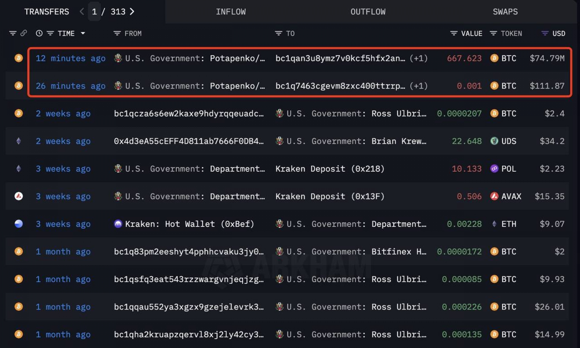 دولت ایالات متحده به‌تازگی ۶۶۷.۶ بیت‌کوین معادل ۷۴.۷۹ میلیون دلار را به یک کیف‌پول جدید منتقل کرد. این حرکت می‌تواند نشان‌دهنده مدیریت ذخایر یا آماده‌سازی برای اقدامات آتی باشد.