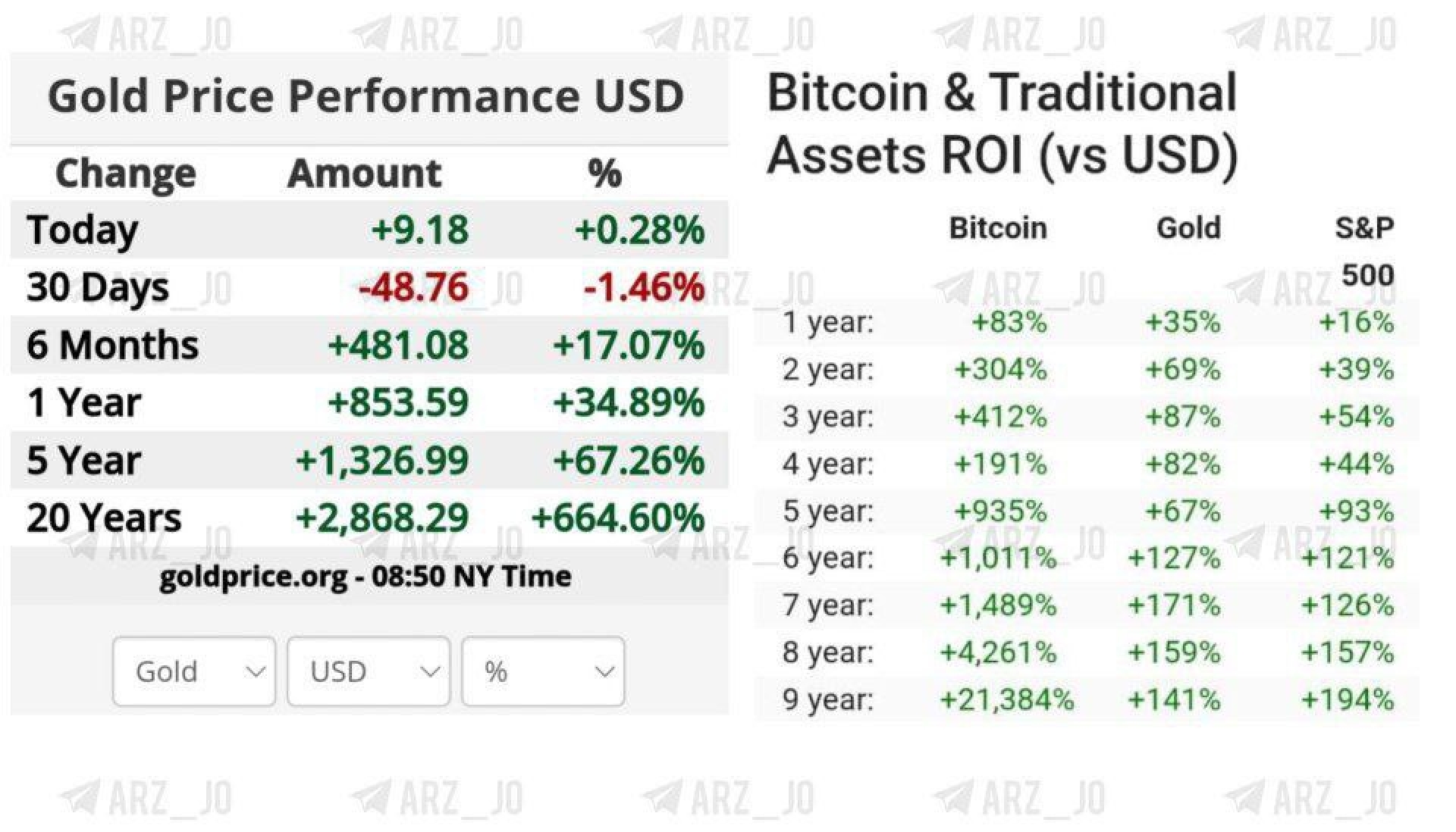طلا طی ۲۰ سال گذشته رشد چشمگیر ۶۶۴٪ را تجربه کرده است، در حالی که بیت‌کوین تنها در ۵ سال اخیر بیش از ۹۳۵٪ افزایش یافته است.