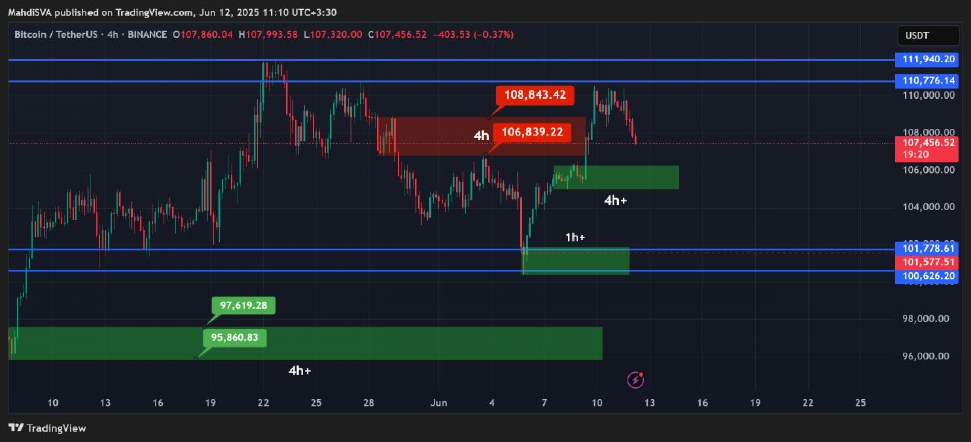 بیت کوین موفق شد مقاومت 106800-108800 را در تایم فریم 4 ساعته بشکند و تا 110500 دلار برسد. بعد از این شکست و پولبک هایی که به مقاومت شکسته شده رخ داده، فشار فروش خاصی دیده نمی شود؛ برخلاف برخورد قبلی به محدوده 110700-111900. در صورت اصلاح بیشتر قیمت، محدوده 4 ساعته 104900-106200 حمایت اول قیمت است. در صورتی که با رسیدن به این محدوده، فشار فروش افزایش یابد، حمایت بعدی قیمت 100600-101700 خواهد بود.