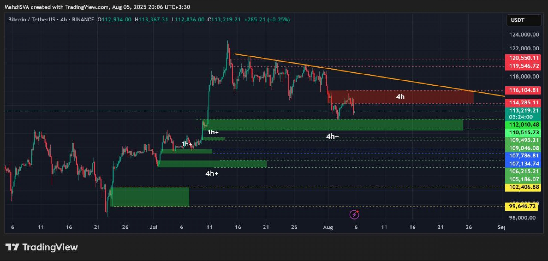 بیت کوین برای سومین هفته متوالی، شاهد افزایش فشار فروش در تایم فریم روزانه است. این فشار فروش به ناحیه اشباع فروش در RSI روزانه نزدیک شده است. با در نظر گرفتن این موضوع و رسیدن قیمت به حمایت ۴ ساعتها 110500-112000، احتمال یک واکنش مثبت در قیمت وجود دارد. مقاومت پیش روی قیمت، محدوده 114280-116100 دلار و همچنین مقاومت دینامیک رسم شده است.