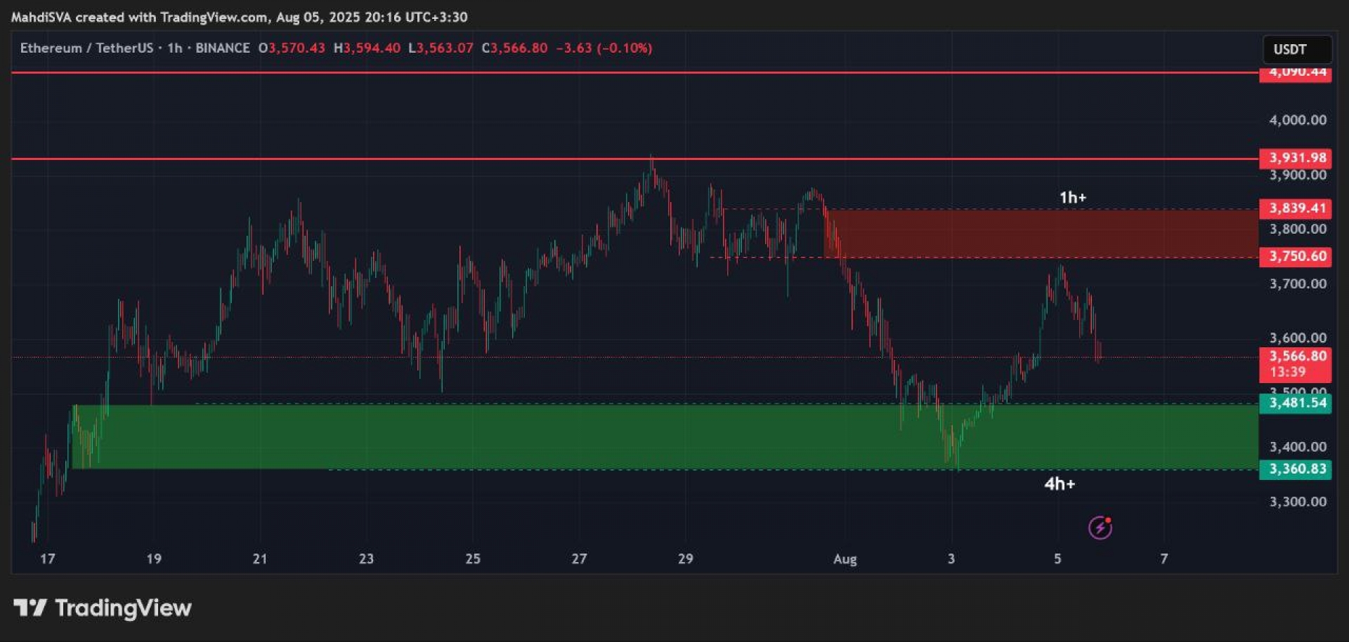 شرایط در مورد اتریوم، کمی متعادل تر است و فشار فروش به اندازه بیت کوین جلب توجه نمی‌کند. در حال حاضر حمایت 3360-3481 دلار حمایت اصلی قیمت در تایم فریم 4 ساعته است. مقاومت اصلی قیمت هم ناحیه 3931-4090 دلار است؛ اگرچه ناحیه یک ساعته 3750-3839 یک ناحیه مقاومتی دیگر بوده که قیمت با نزدیک شدن به آن با فشار عرضه اتریوم مواجه شده. بدیهی است که با کاهش فشار فروش و بازگشت قیمت از ناحیه حمایتی 4 ساعته، قیمت می تواند از ناحیه 1 ساعته نیز عبور کند.