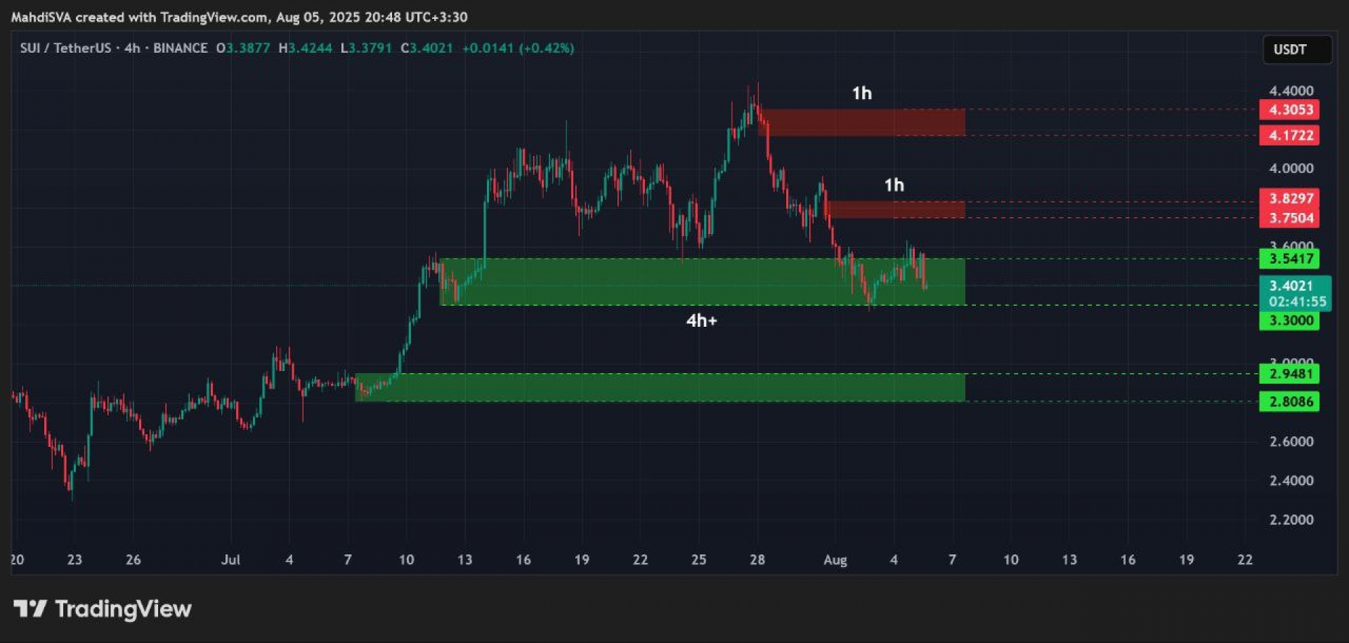 ارز سوئی درون محدوده حمایتی 4 ساعته 3.3-3.54 قرار دارد. در صورت بهبود شرایط بازار، اولین هدف قیمت محدوده یک ساعته 3.75-3.82 است. اگر حرکت آغاز شده با ورود سرمایه همراه باشد( که فعلا این طور نیست) قیمت به راحتی تا محدوده یک ساعته دوم یعنی 4.17-4.3 حرکت خواهد کرد.