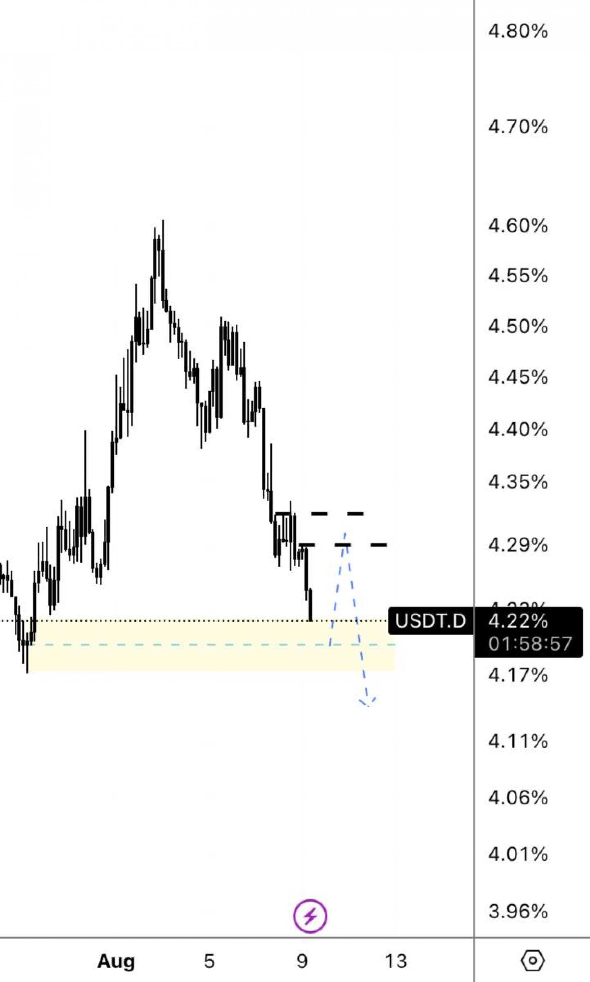 به نظر می‌رسه دامیننس تتر با رسیدن به این محدوده، واکنش اولیه‌ای نشون بده و کمی بازگشت (Pullback) داشته باشه. این حرکت می‌تونه در بازار کریپتو به شکل یک پولبک قیمتی و فرصت خرید کوتاه‌مدت دیده بشه.