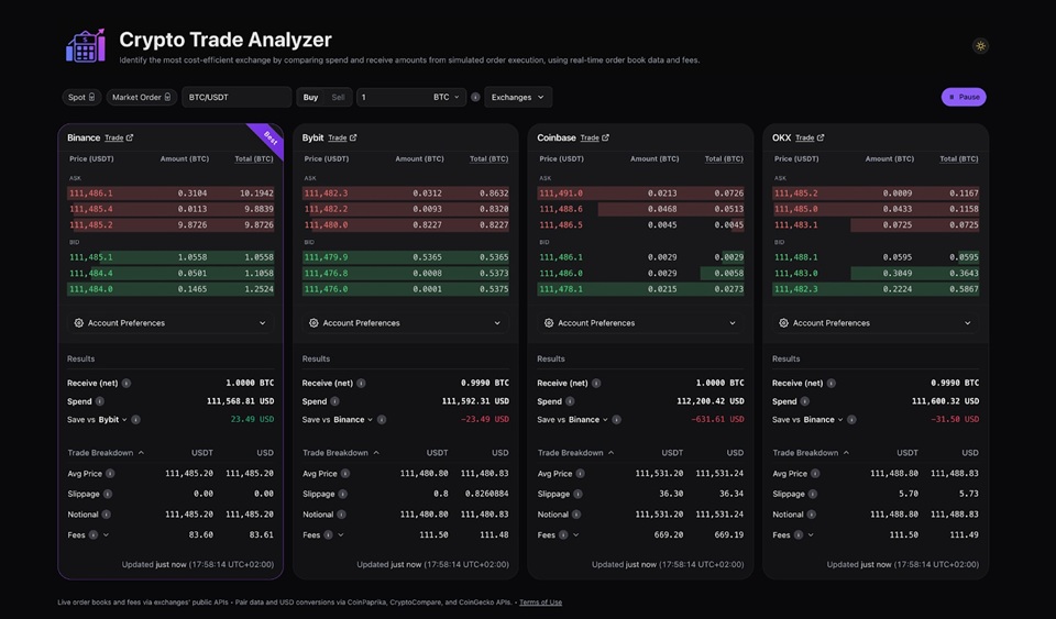 تحلیلگر معاملات کریپتو، دادههای زنده بازار، ساختارهای معاملاتی اکسچنجها و تنظیمات مورد نظر کاربر را ترکیب میکند تا هزینه واقعی اجرای یک معامله را در هر کدام از اکسچنجهای تحت پشتیبانی برآورد کند. کاربرد این ابزار، نمایش قیمت مؤثر و هزینه دریافتی یا پرداختی واقعی تریدر است.