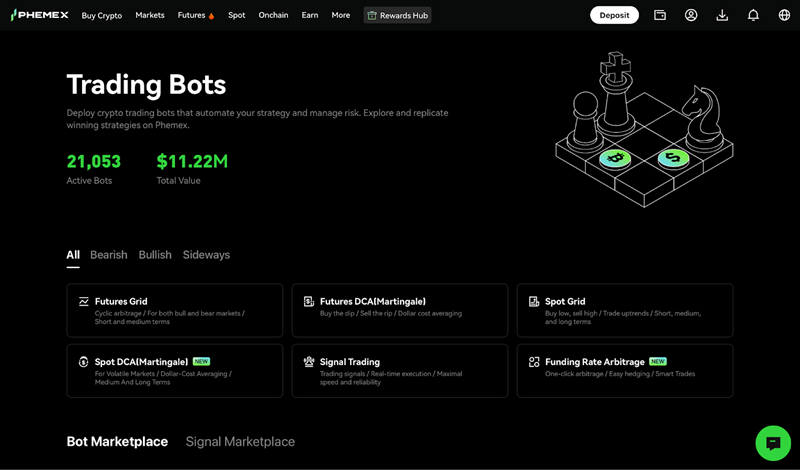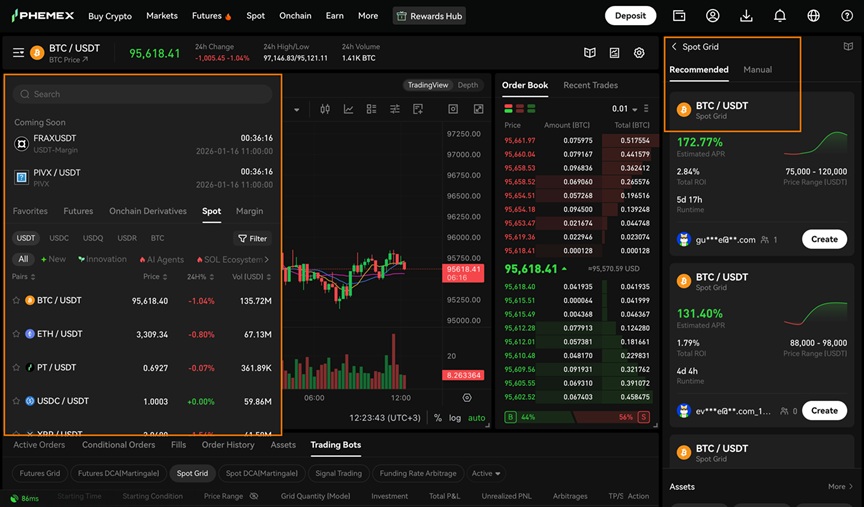 در ادامه برای مثال نگاهی داریم به Phemex که بهترین ستاپهای گرید تریدینگ در آن تنظیم میشوند.