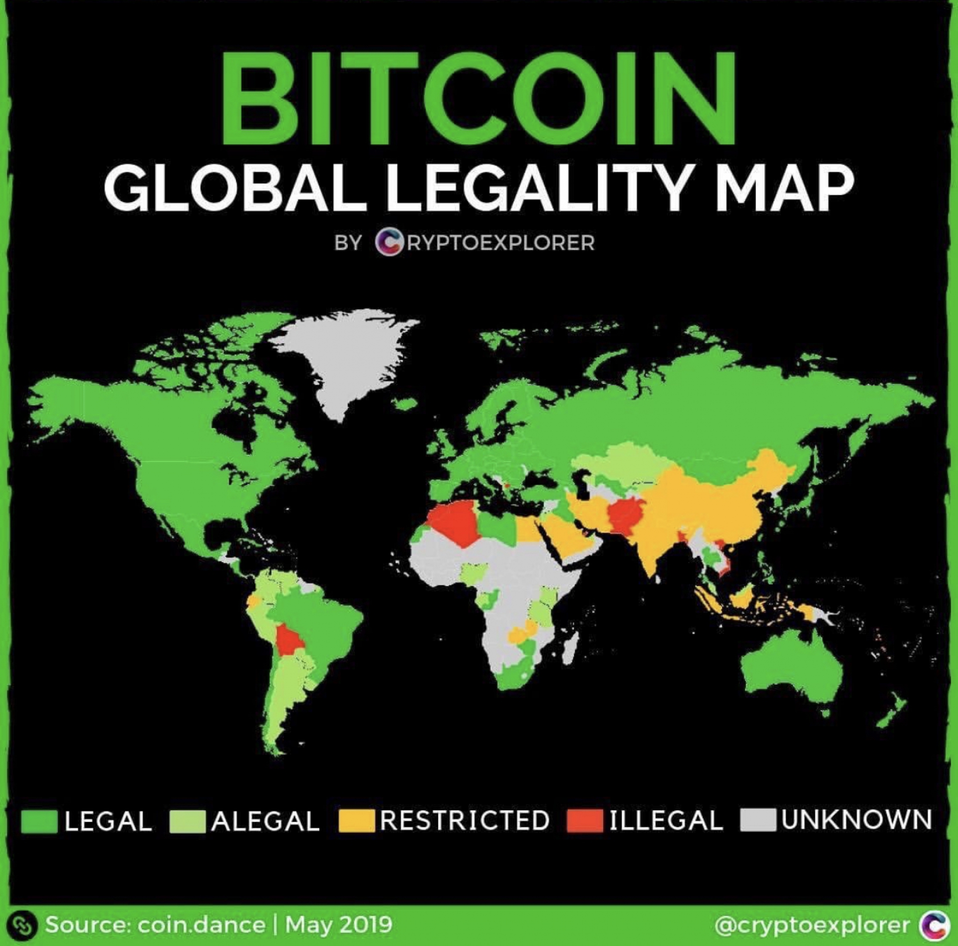 نقشه جهانى بالا قانونمندی بيت كوين را در تمامى قاره ها نشان مى دهد. اين نقشه قانونمندی  بيت كوين را به گروه هاى قانونى، مورد تاييد، غيرقانونى، داراى محدوديت و ناشناخته تقسيم بندى مى كند.