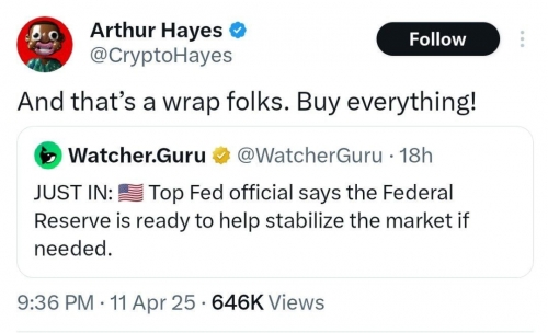 آرتور هیز، بنیان‌گذار صرافی بیت‌مکس، به سرمایه‌گذاران توصیه کرده است که «همه‌چیز را بخرند» و سیگنال‌های اخیر فدرال رزرو را به‌عنوان نشانه‌ای صعودی برای بازار کریپتو تفسیر کرده است
