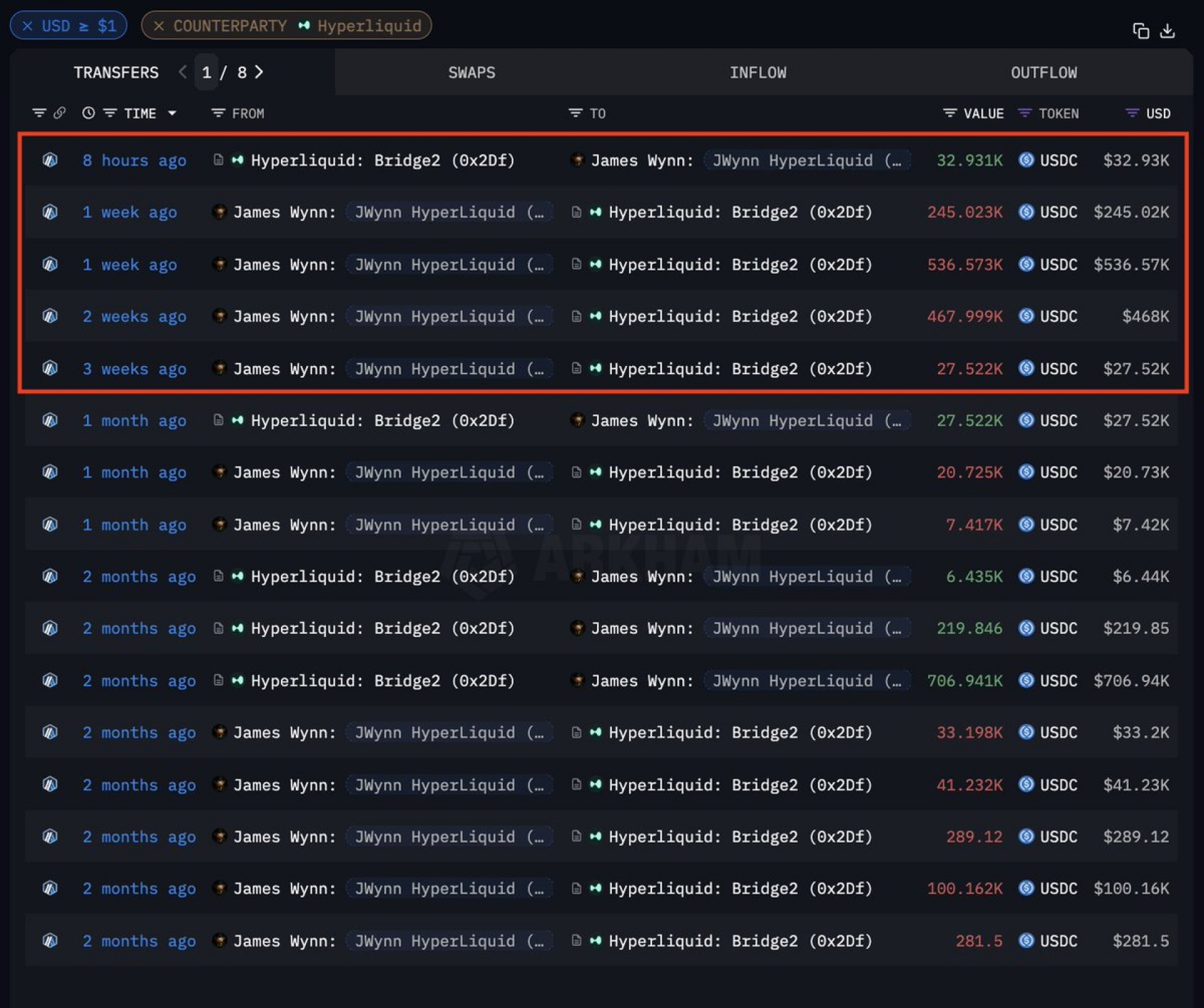 جیمز وین، نهنگ شناخته‌شده پلتفرم Hyperliquid، در جولای ۱.۲۸ میلیون دلار واریز کرده بود، اما با لیکوئید شدن موقعیت ۲.۹۹ میلیون دلاری‌اش روی kPEPE، تقریباً همه سرمایه خود را از دست داد و تنها ۳۲.۹۳ هزار دلار موفق به برداشت شد.