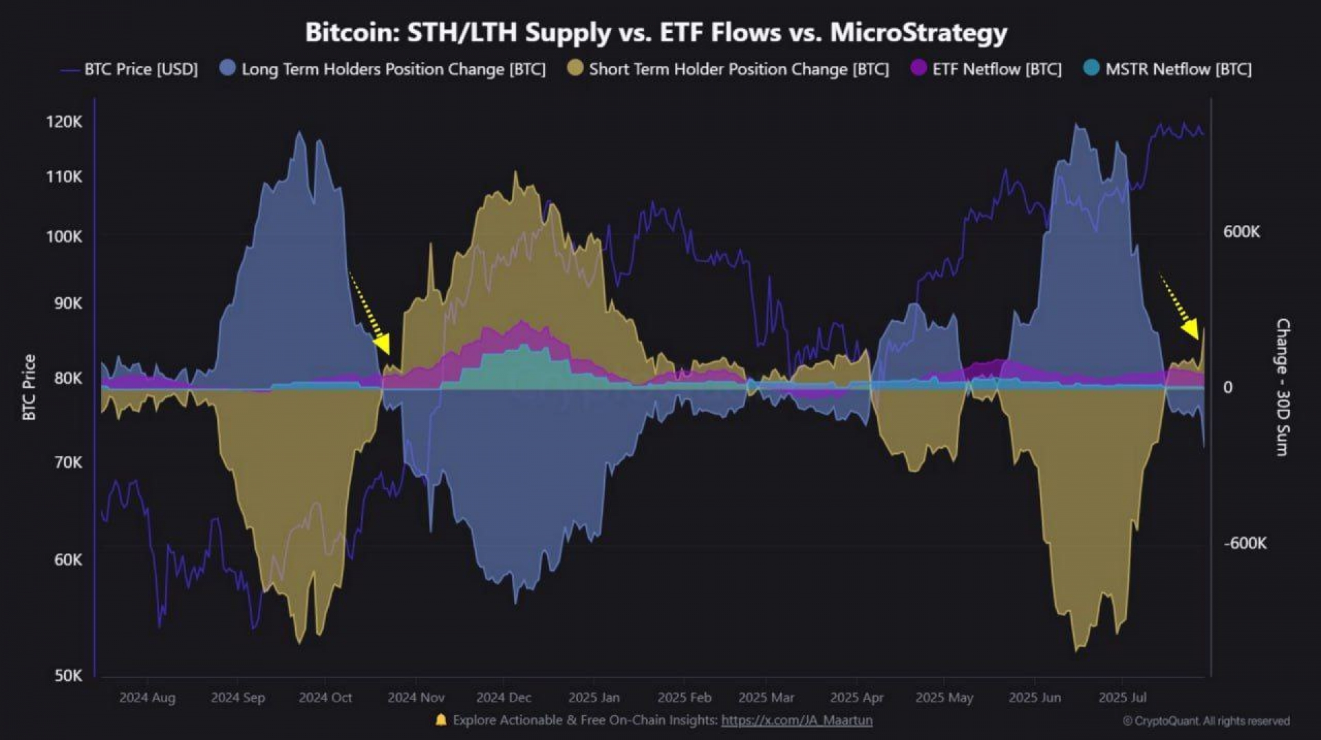 داده‌های آنچین نشان می‌دهد دارندگان کوتاه‌مدت (STH) دوباره فعال شده‌اند؛ الگویی که معمولاً پیش از رشد قیمت بیت‌کوین رخ می‌دهد.