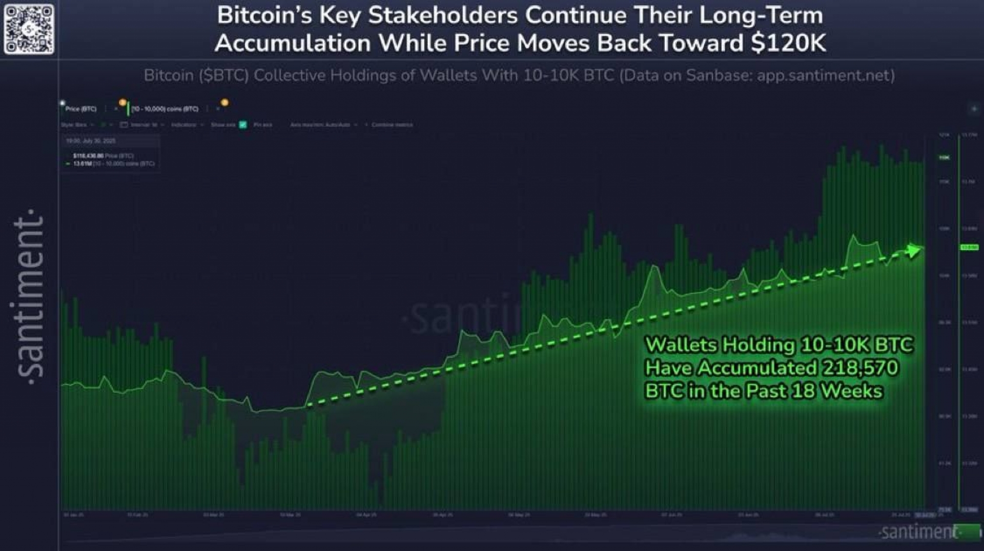 داده‌ها نشان می‌دهد نهنگ‌های بیت‌کوین طی ۴ ماه گذشته حدود ۱٪ از کل عرضه این ارز دیجیتال را خریداری کرده‌اند، که نشان‌دهنده انباشت قابل توجه توسط سرمایه‌گذاران بزرگ است.
