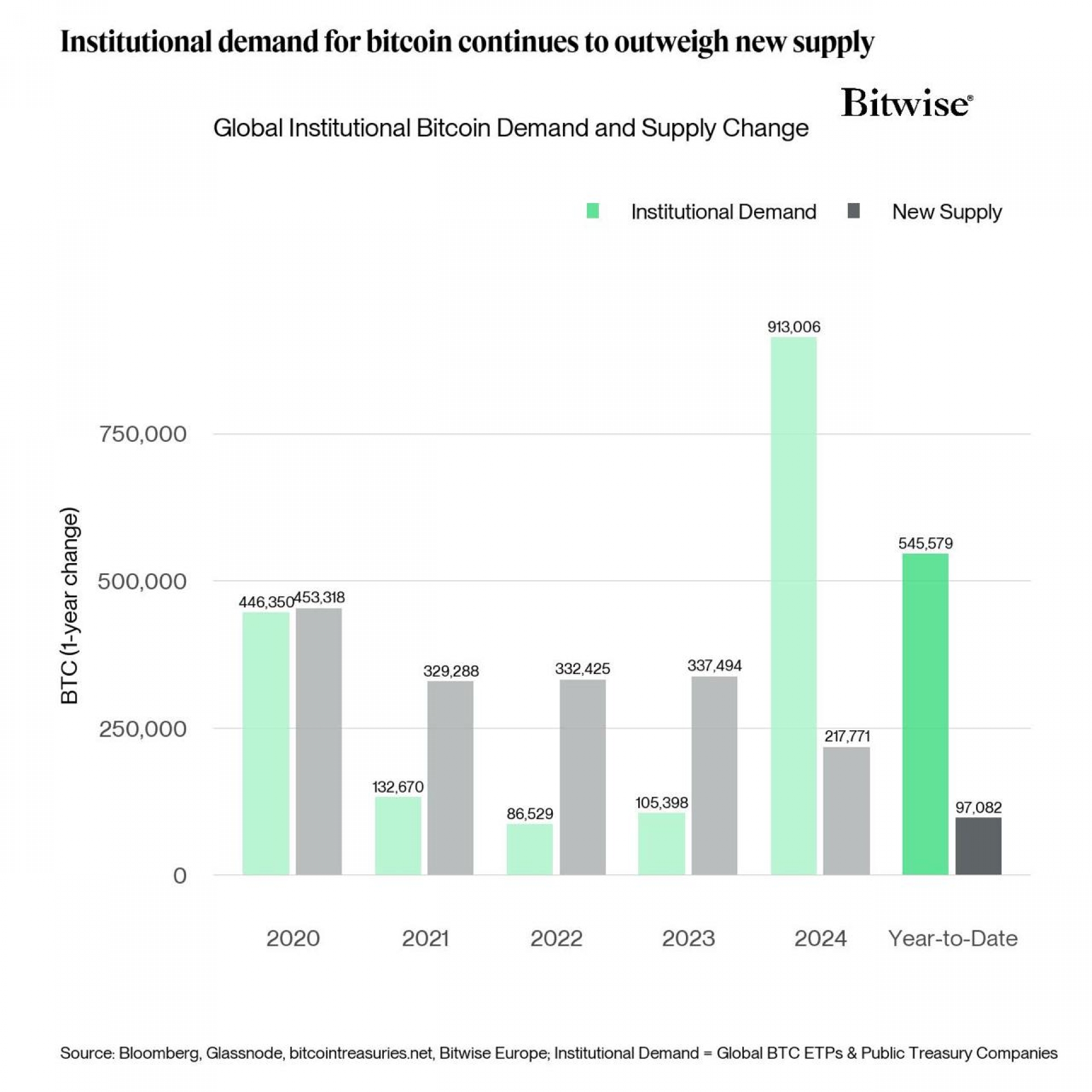 از ابتدای سال تاکنون، نهادهای سرمایه‌گذاری ۵۴۵,۵۷۹ بیت‌کوین خریداری کرده‌اند، در حالی که تنها ۹۷,۰۸۲ بیت‌کوین به عرضه جدید اضافه شده است. یادآوری: عرضه کل بیت‌کوین هرگز از ۲۱ میلیون واحد فراتر نخواهد رفت.
