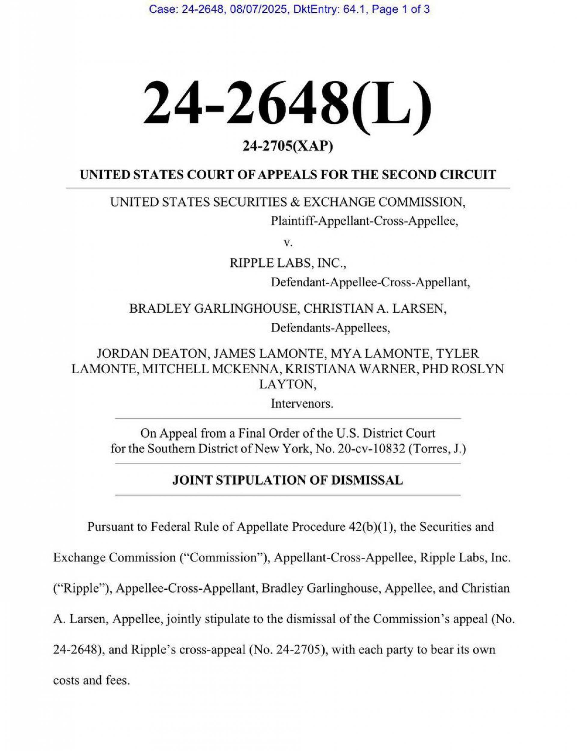 کمیسیون بورس آمریکا (SEC) و شرکت ریپل به‌طور مشترک تمام درخواست‌های تجدیدنظر را پس گرفتند و به نبرد حقوقی ۵ ساله خود پایان دادند.
