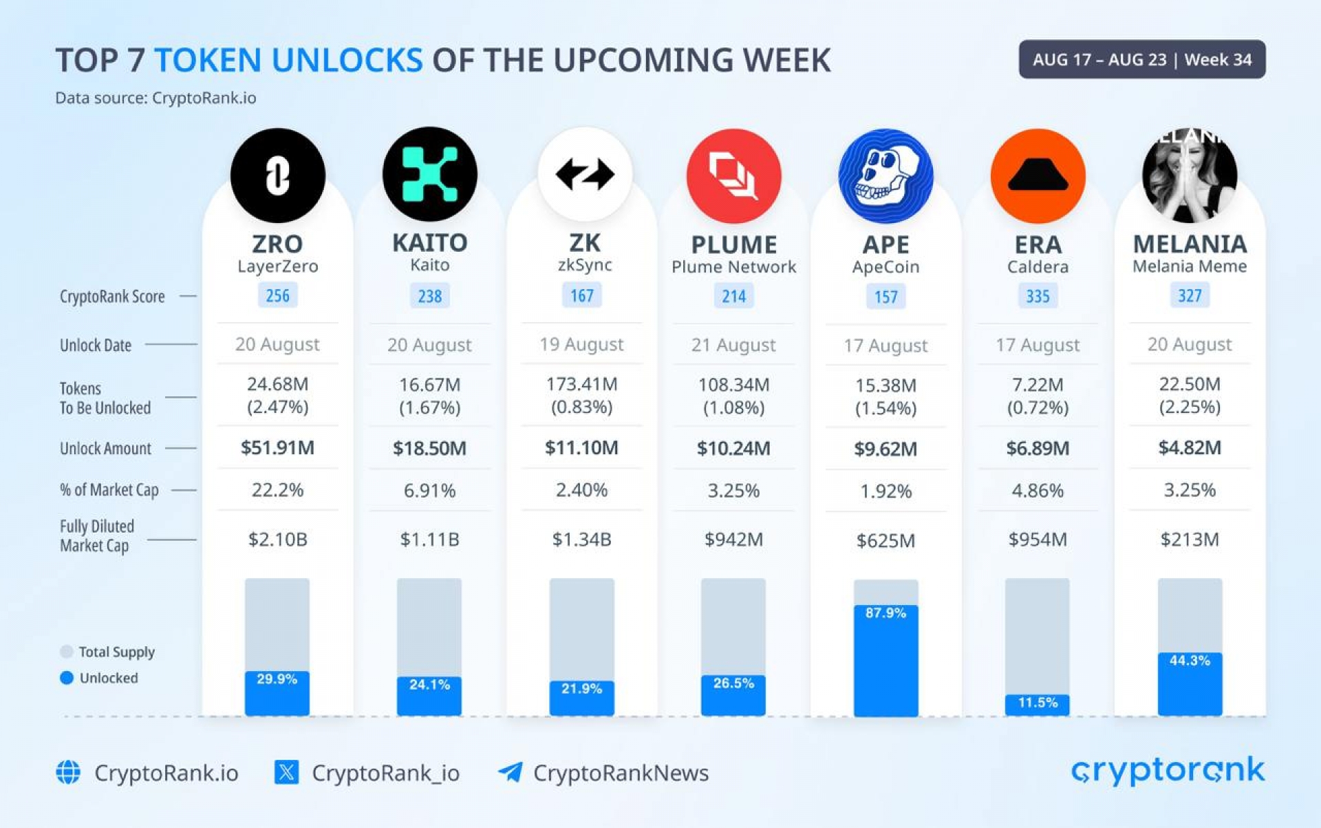 پروژه ZRO قصد دارد در هفته پیش‌ِ رو توکن‌هایی به ارزش ۵۱.۹۱ میلیون دلار آزاد کند. مجموع شش آزادسازی بعدی نیز کمی بیش از ۶۱ میلیون دلار برآورد می‌شود.