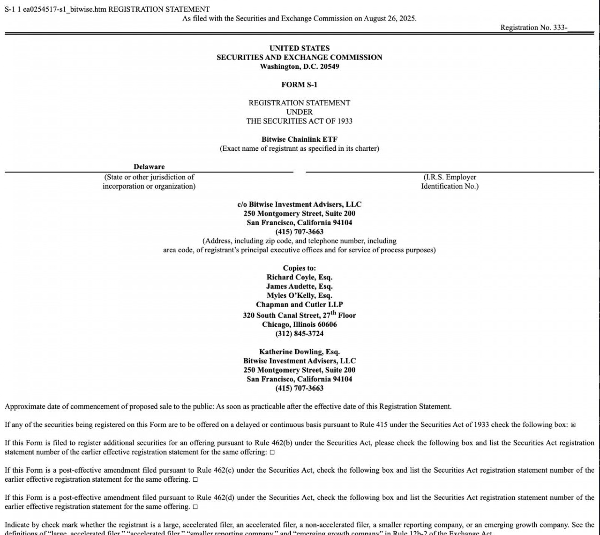 شرکت Bitwise با ثبت فرم S-1 نزد کمیسیون بورس و اوراق بهادار آمریکا (SEC)، برای راه‌اندازی یک ETF مبتنی بر چین‌لینک اقدام کرده است.